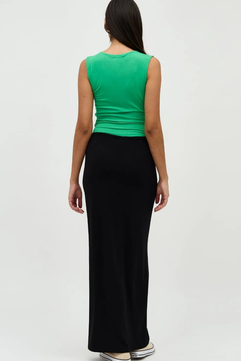 Sort nederdel fra MbyM i ankellængde med snøredetalje i taljen. Nederdelen er lavet af et blødt og åndbart materiale med god stræk.