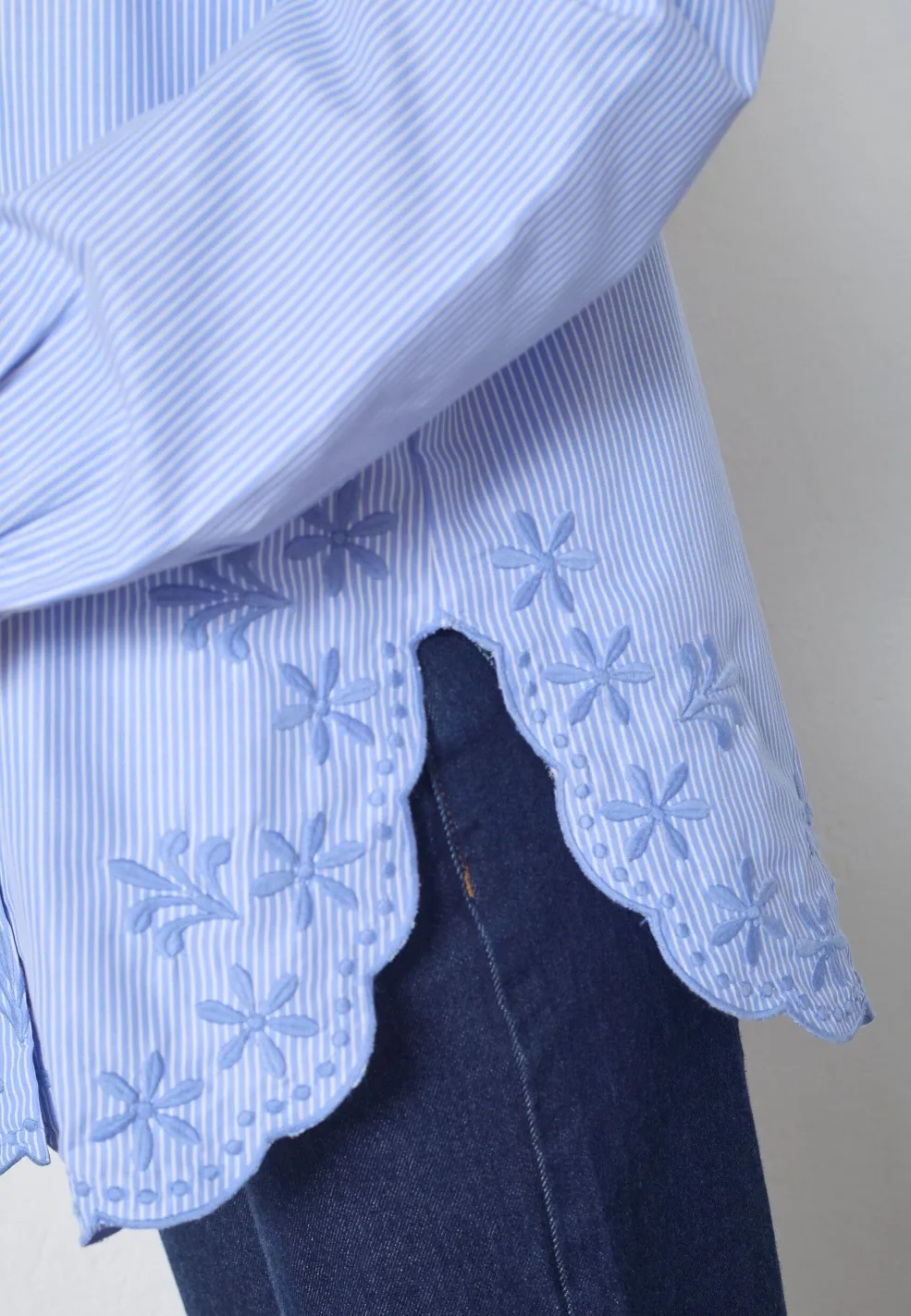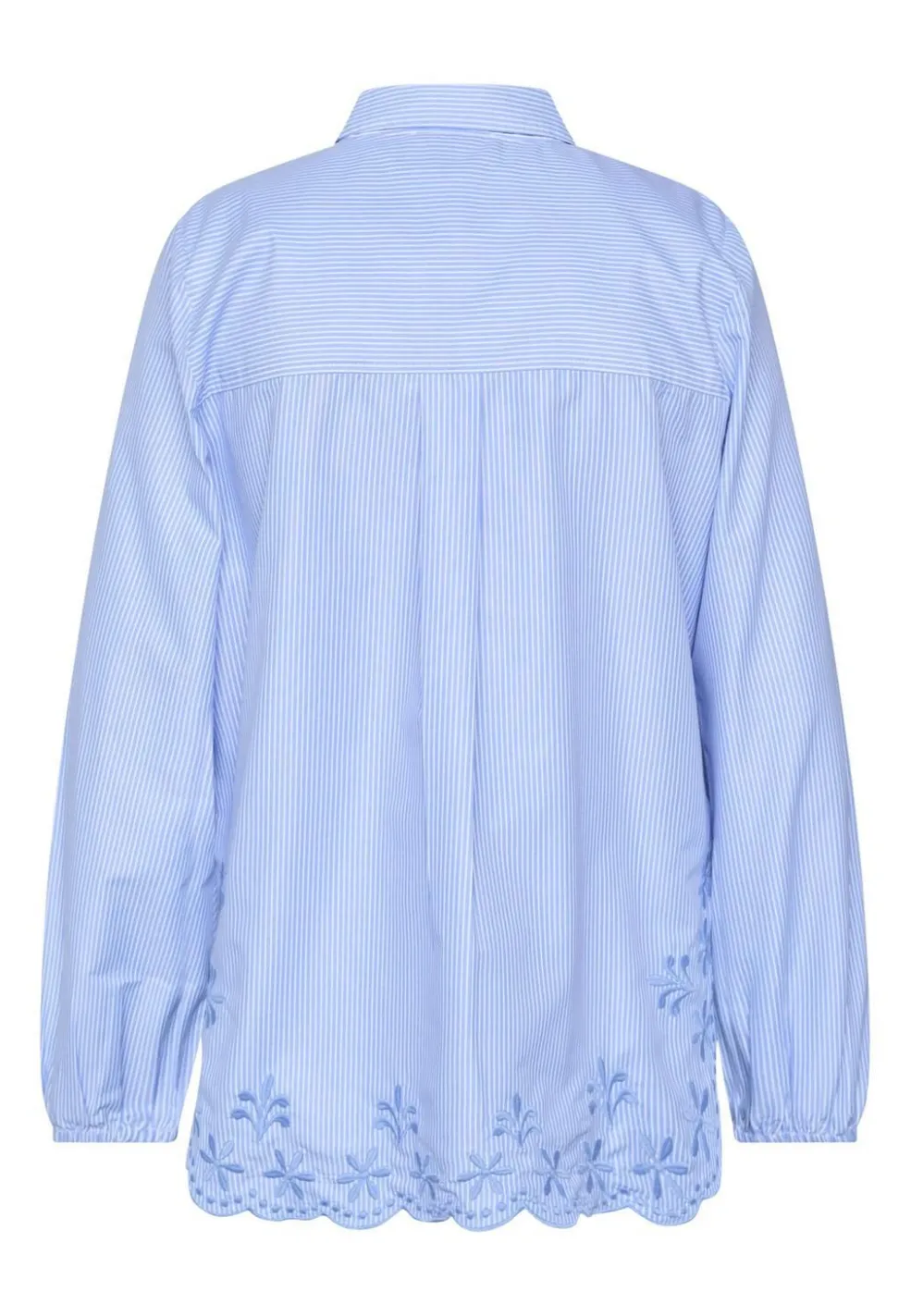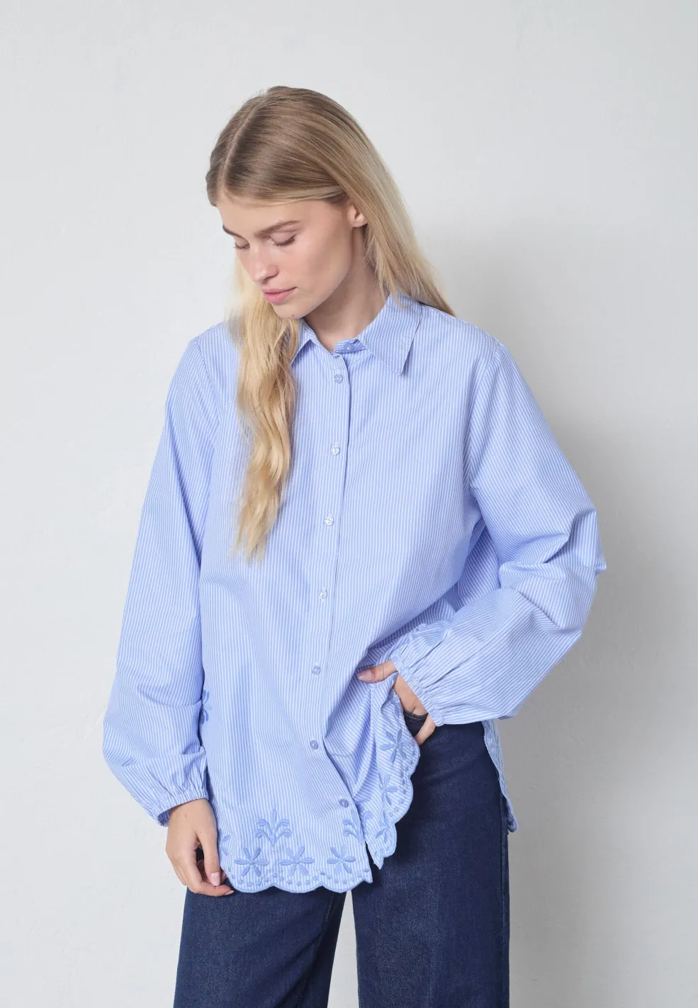 Stribet skjorte fra Sisters Point med lyseblå og hvide striber. Skjorten har broderede blomster langs den nederste kant.