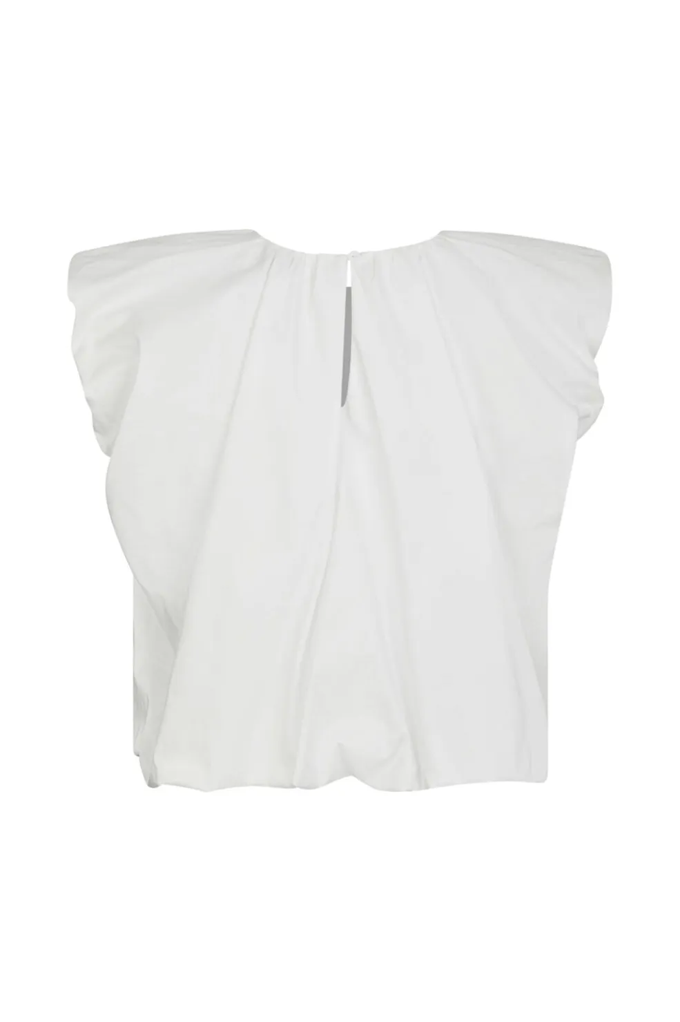 Hvid poplin-top fra Neo Noir med puffede ærmer og flæsedetaljer. Toppen har en løs pasform og rund halsudskæring med knapper og pulloverlukning.