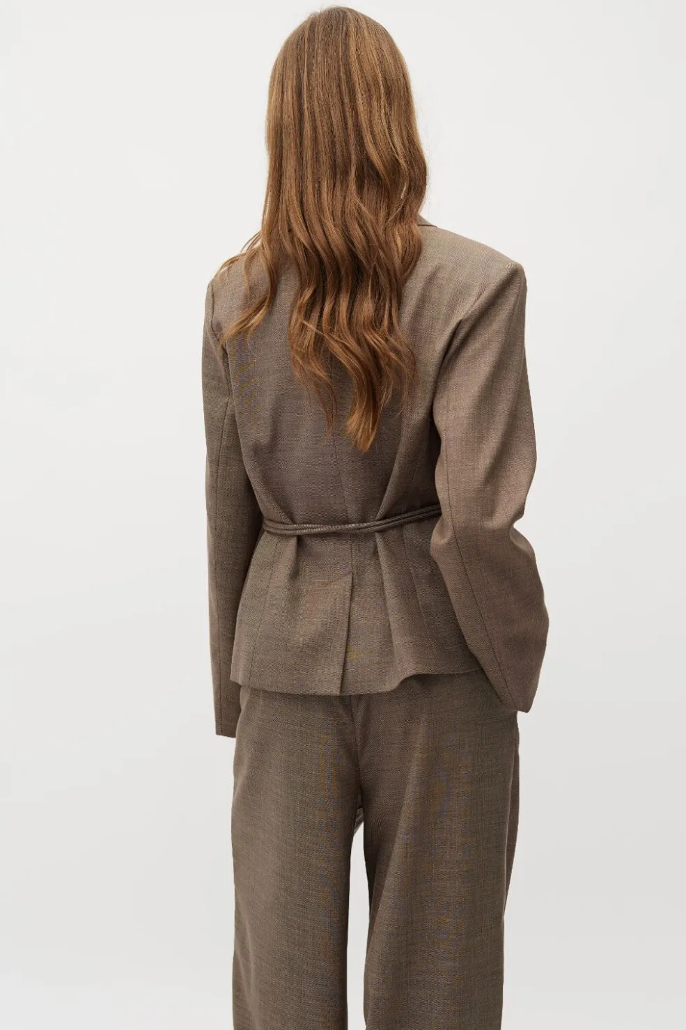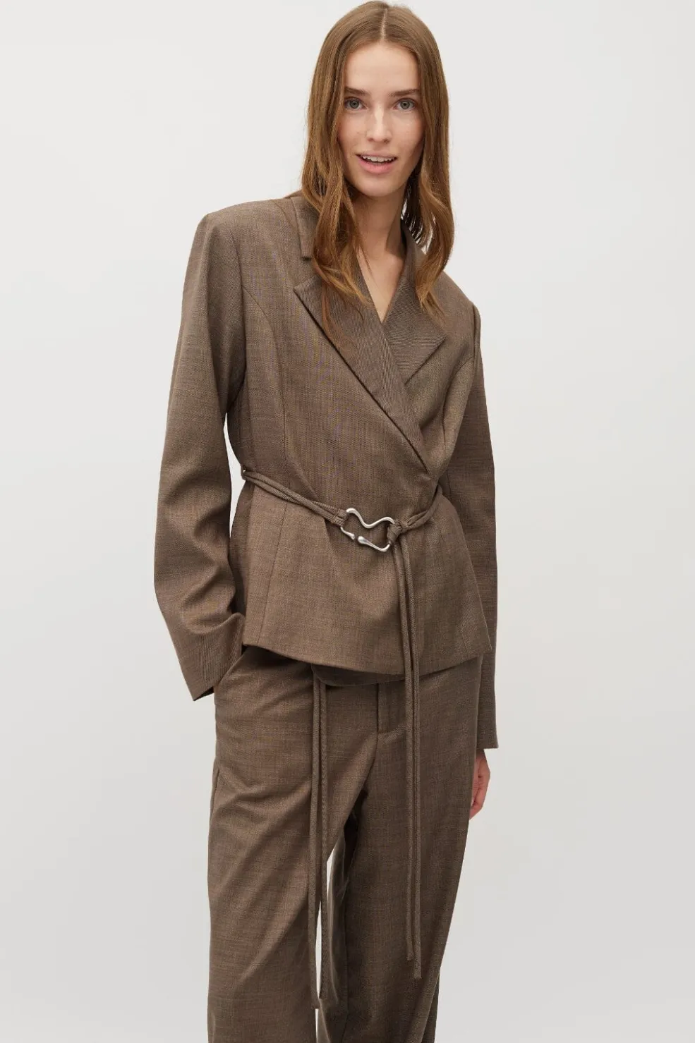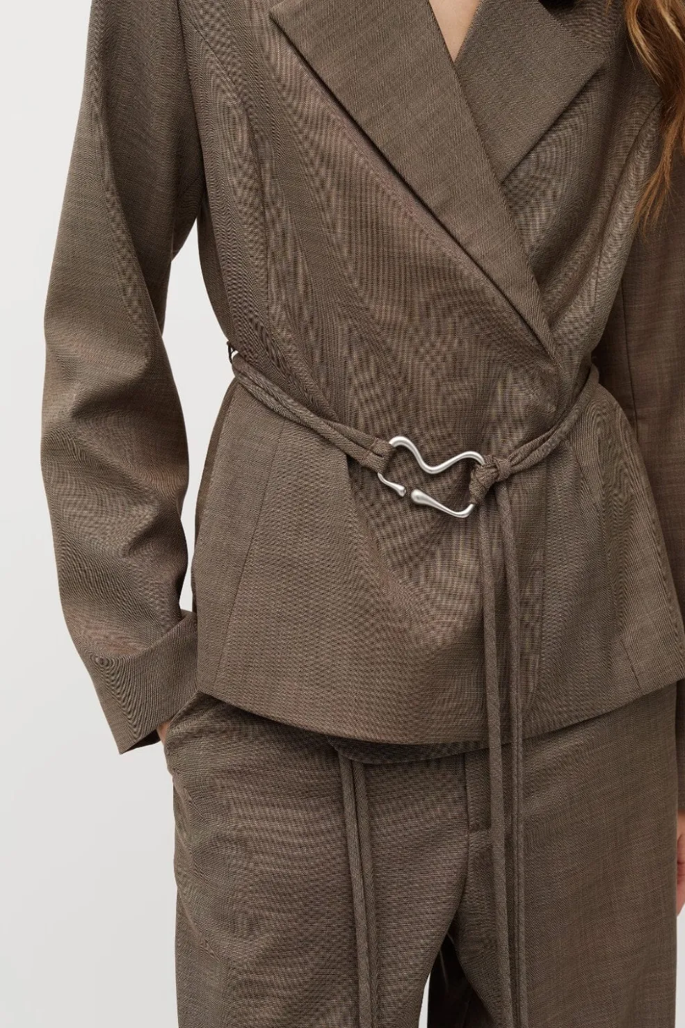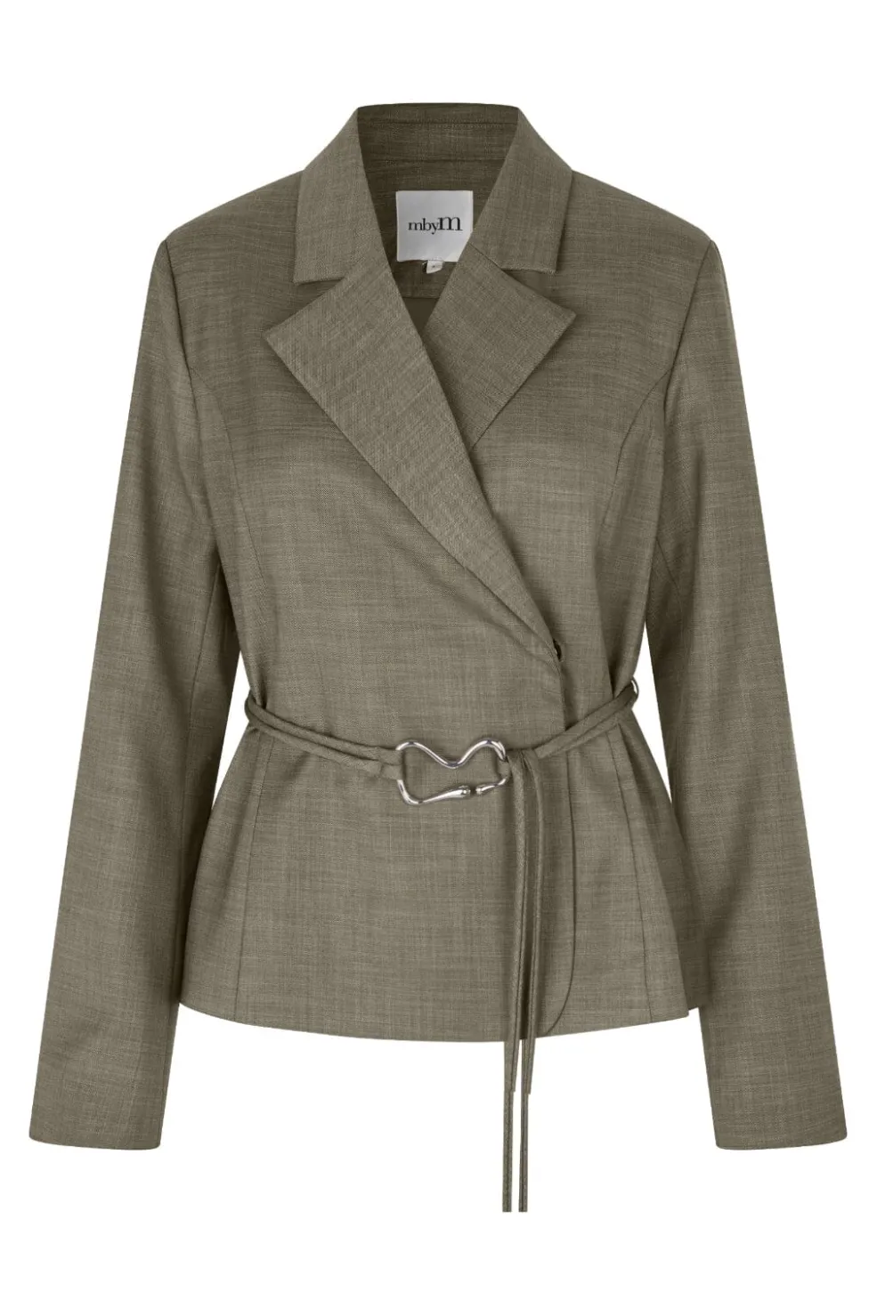 Brun indpakningsjakke fra MbyM med struktureret overflade. Jakken har V-udskæring og lange ærmer. Den kan bruges til både hverdag og formelle anledninger.