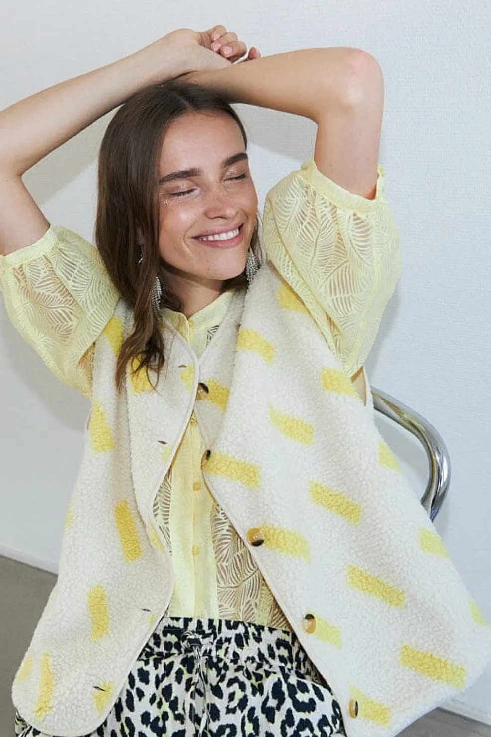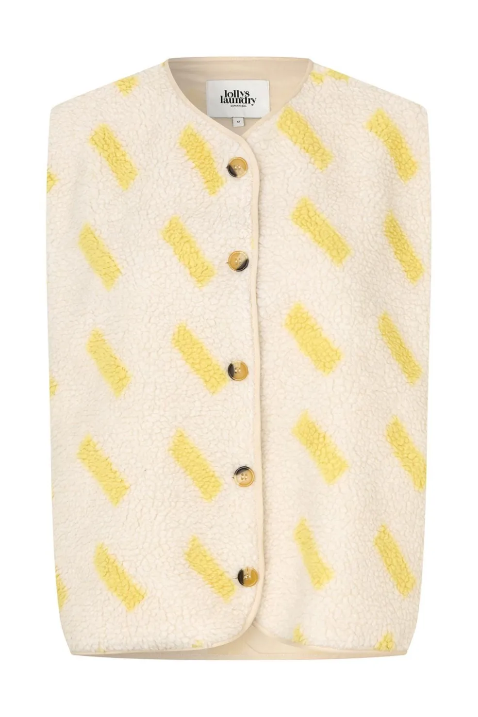 Ærmeløs vest fra Lollys Laundry med et geometrisk mønster af gule rektangler på cremebaggrund. Den har rund halsudskæring og knapper foran.