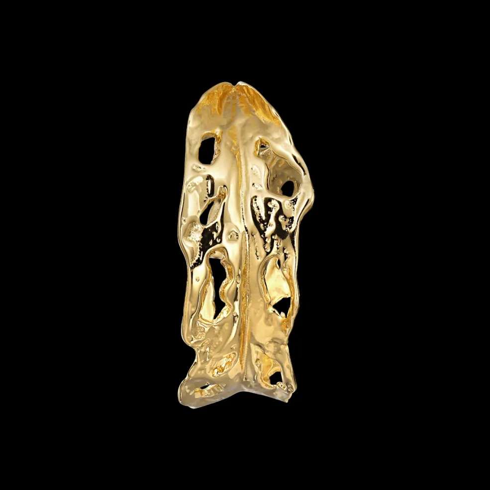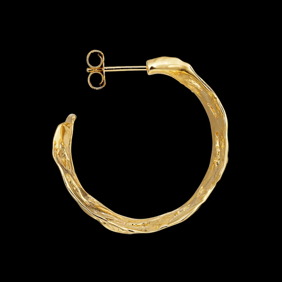 Forgyldt hoop-ørering fra Jane Kønig med en organisk bladform. Øreringen har ujævne kanter og huller i designet, fremstillet i sterling sølv med en gylden overflade.