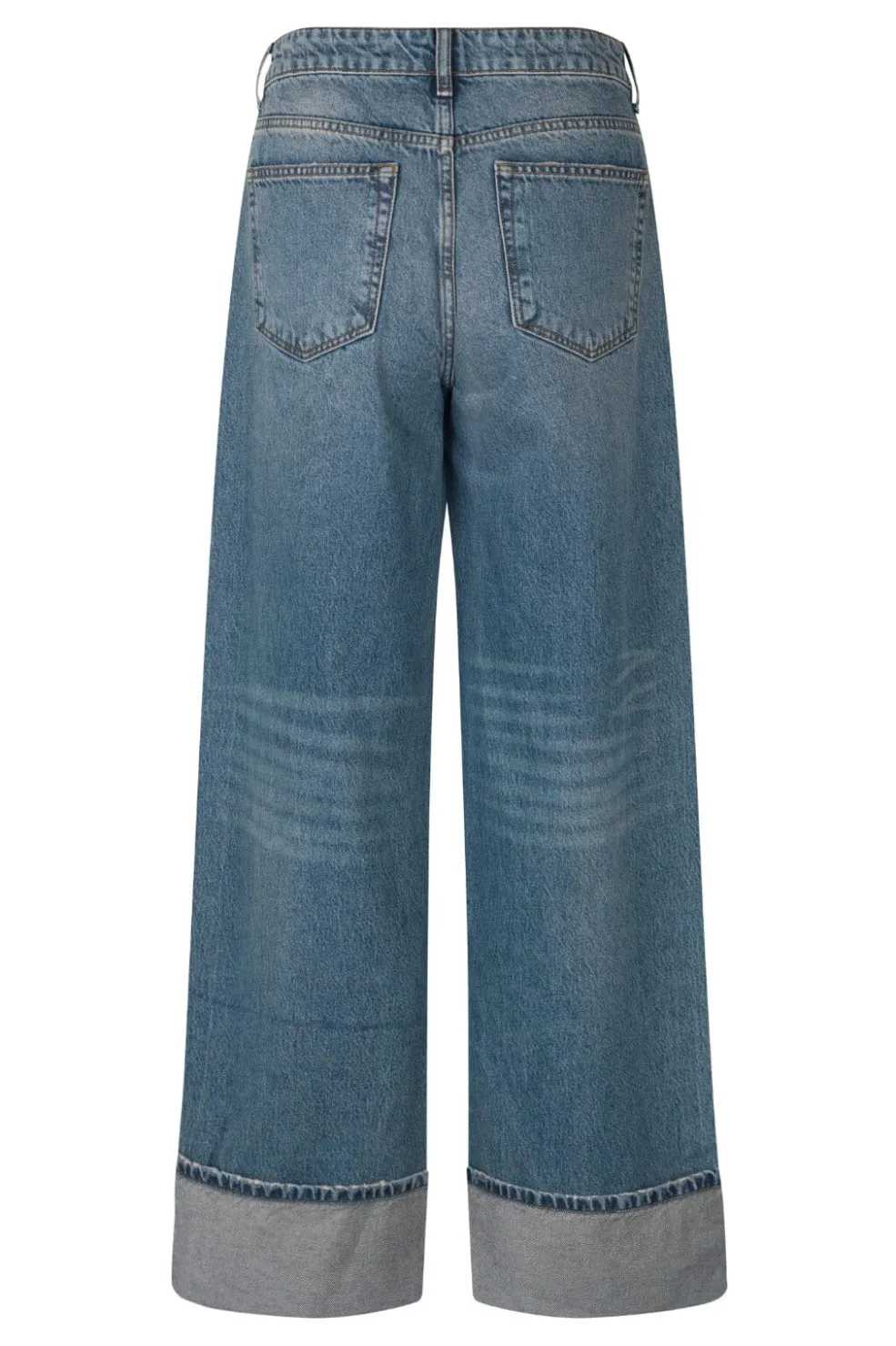 Jeans fra MbyM i en vasket blå farve. Jeansene har en bred benform med foldet kant nederst på benene.
