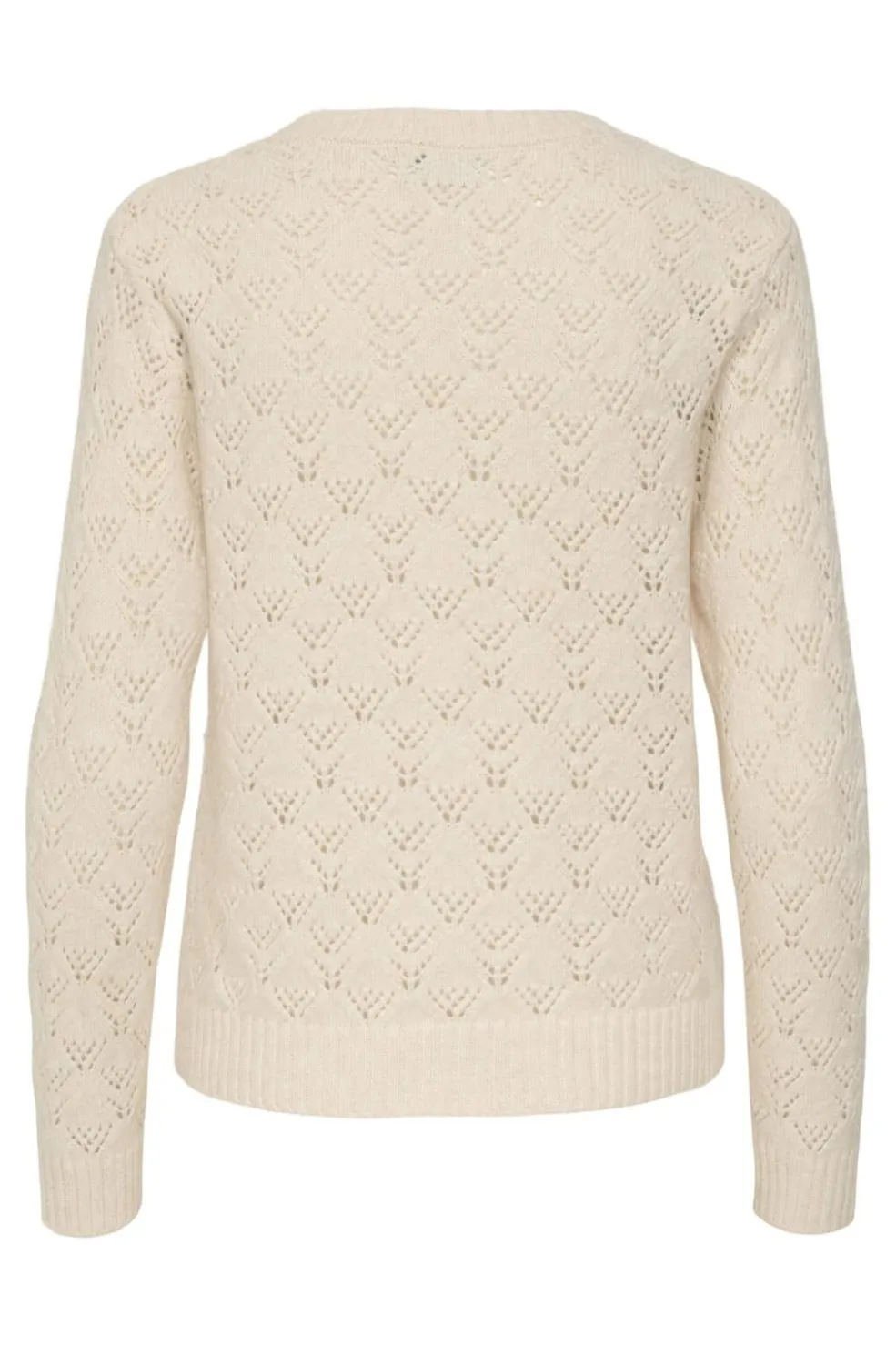 Striktrøje fra JDY i en lys grå-beige nuance. Trøjen har et åbent strikmønster med dekorative syninger og ribkanter ved halsen, ærmerne og bunden.