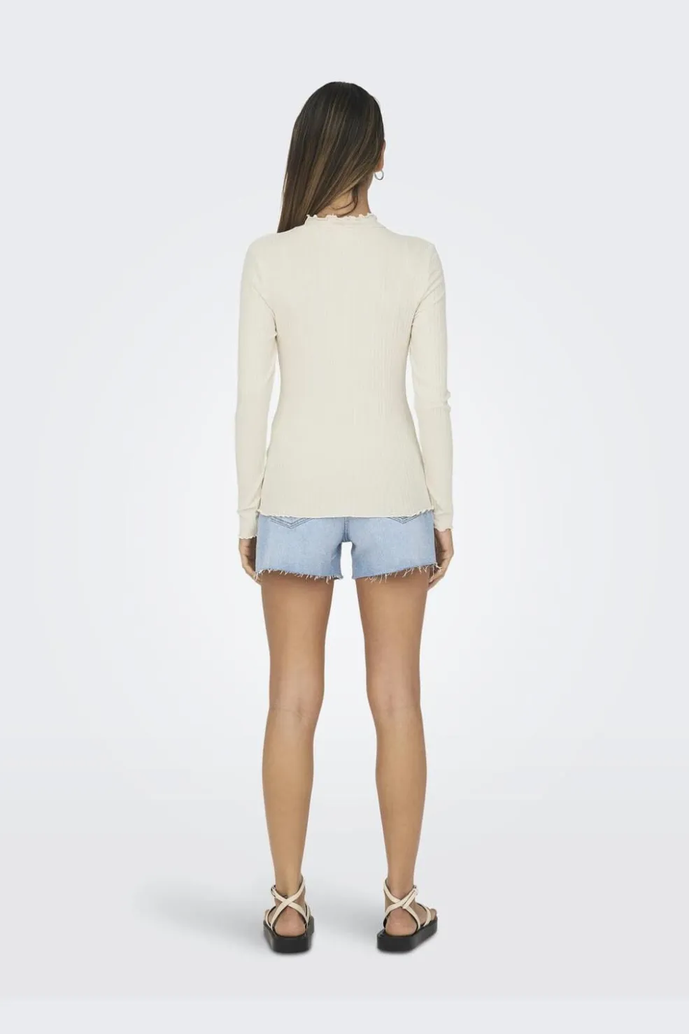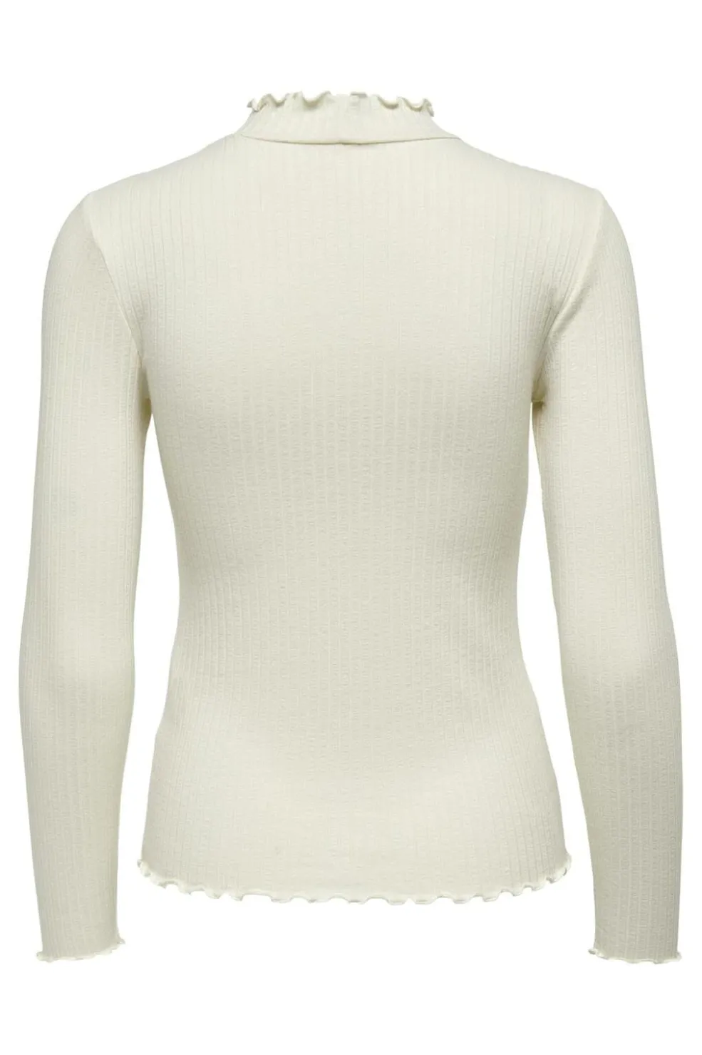 Langærmet top fra JDY i lys grå med høj hals og bølgekant. Den ribbede struktur og stretchmaterialet giver en tætsiddende pasform med god bevægelsesfrihed.
