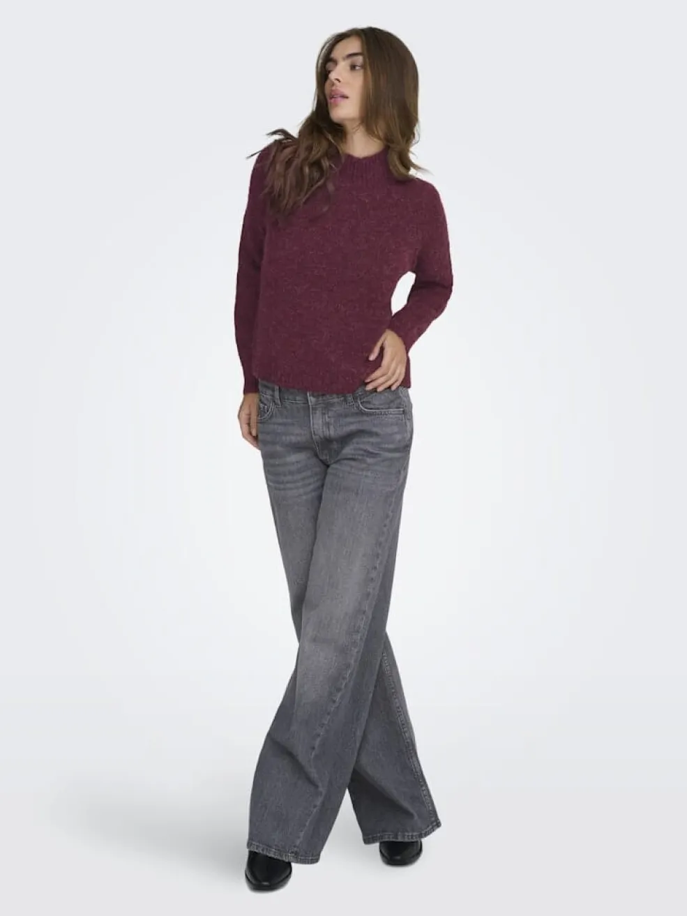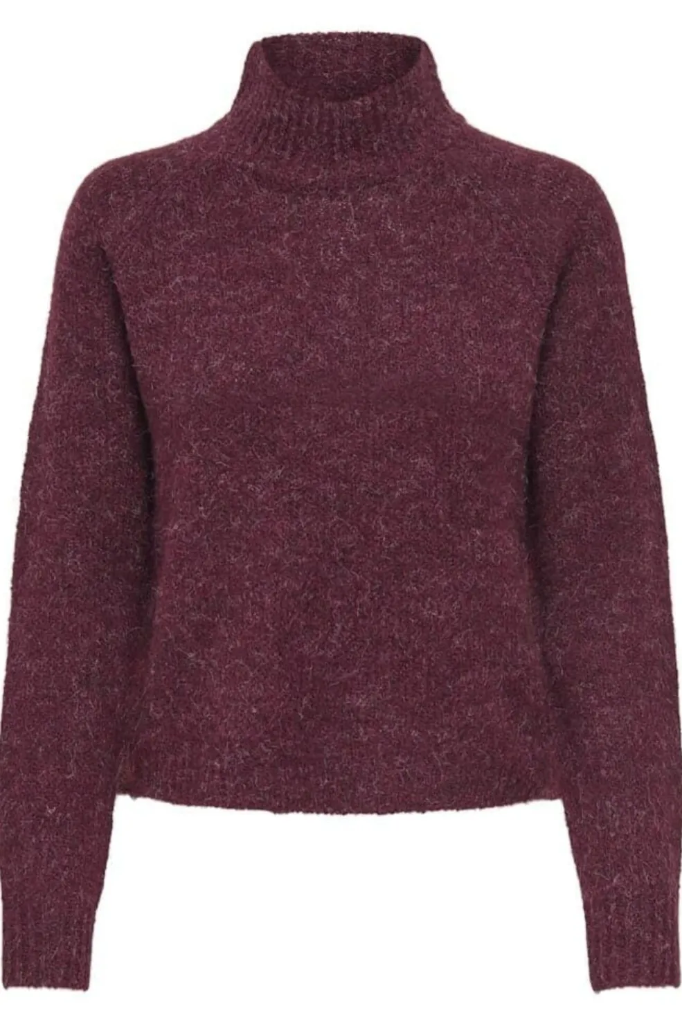 Striktrøje fra JDY i maroonfarvet melange. Den høje hals og raglanærmer giver trøjen en afslappet stil, mens ribkanten ved ærmerne sikrer en god pasform.
