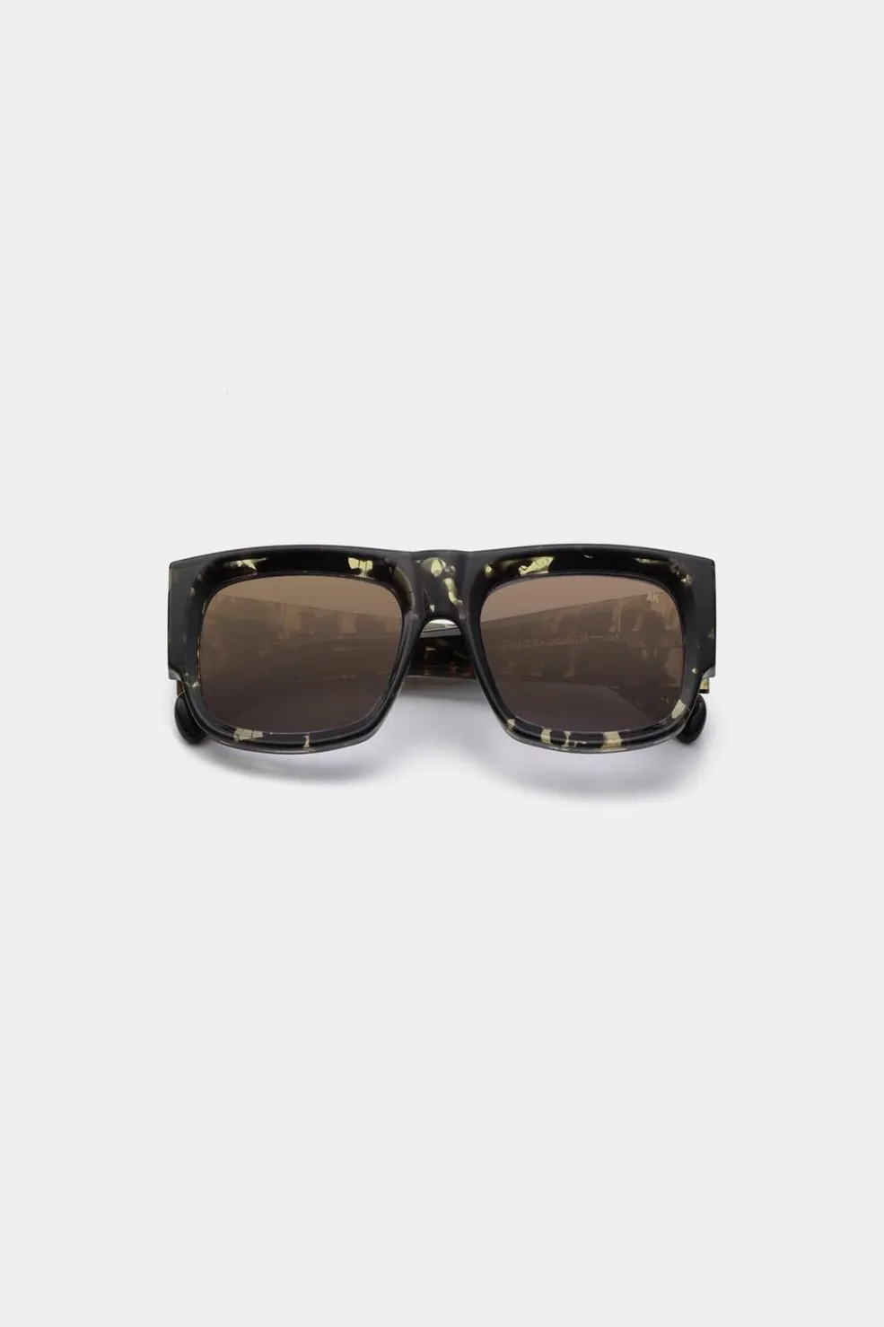 Rektangulære solbriller fra A. Kjærbede med sort og gul tortoise-mønstret stel og brune linser. Stellet har en klassisk form med brune linser og UV 400-beskyttelse.