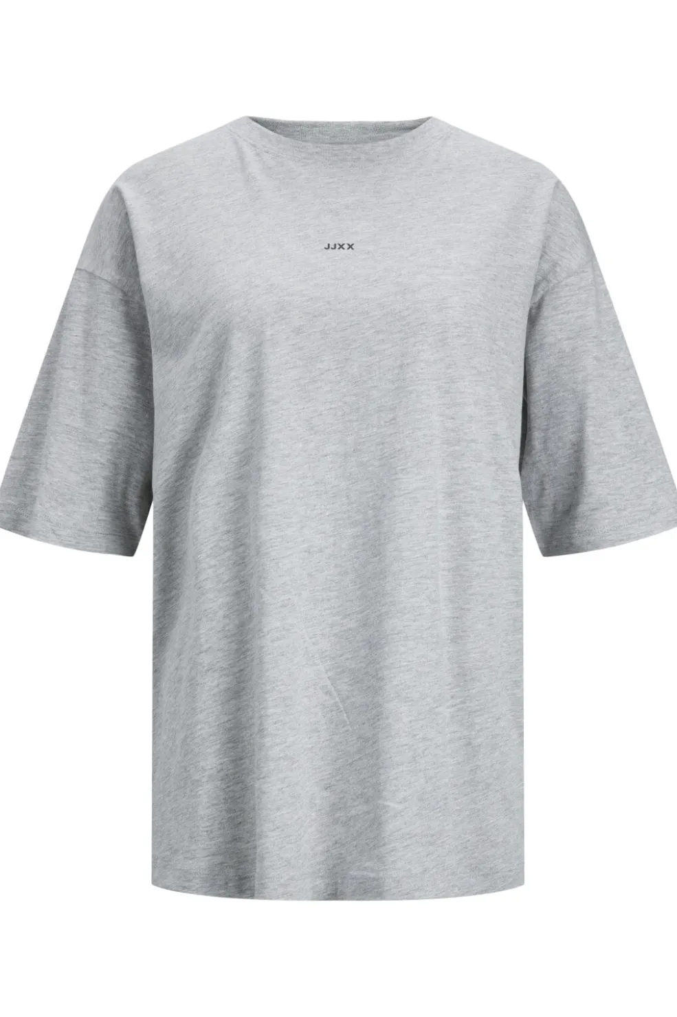 Lysegrå t-shirt fra Jjxx i jersey-stof med et diskret logo-print. T-shirten har en loose fit-pasform med korte ærmer og rund halsudskæring i et meleret look.
