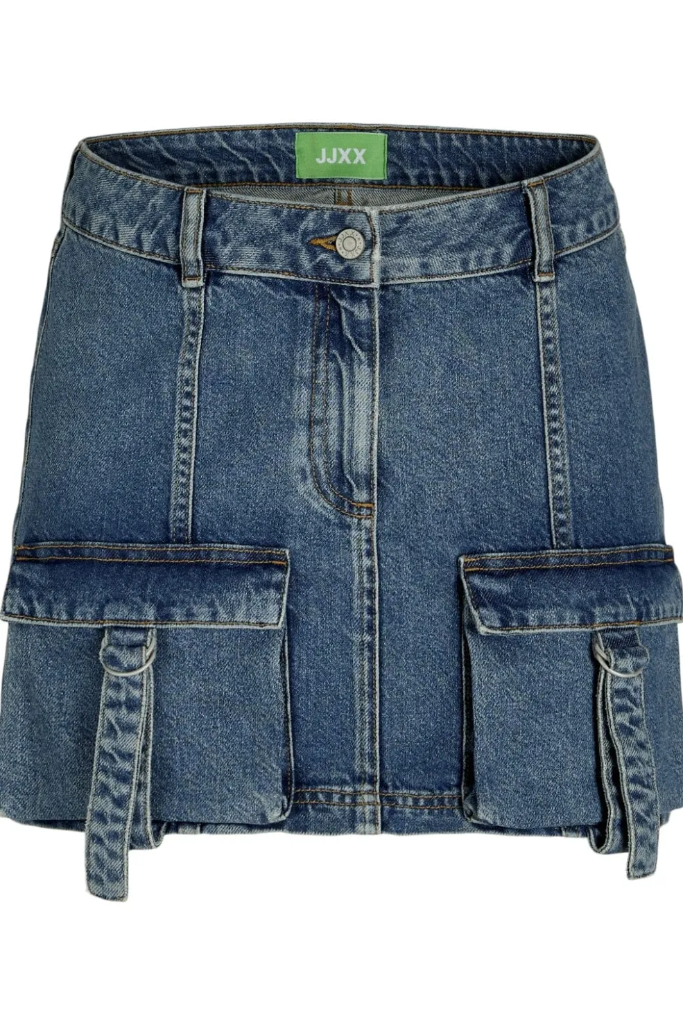 Denimnederdel fra Jjxx i mellemblå farve med stone wash-behandling. Nederdelen har et casual udtryk med praktiske cargo-lommer og er lavet af slidstærkt twillmateriale med farvede, vævede garner.