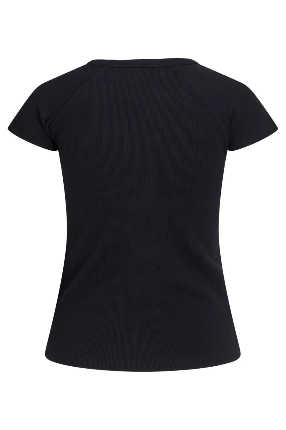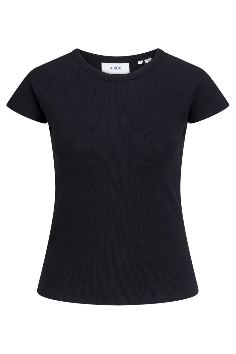 Sort t-shirt fra Jjxx i ribstrik med stretch-pasform. T-shirten har en rund halsudskæring og korte ærmer. Den tætsiddende pasform følger kroppens linjer og giver god bevægelsesfrihed.