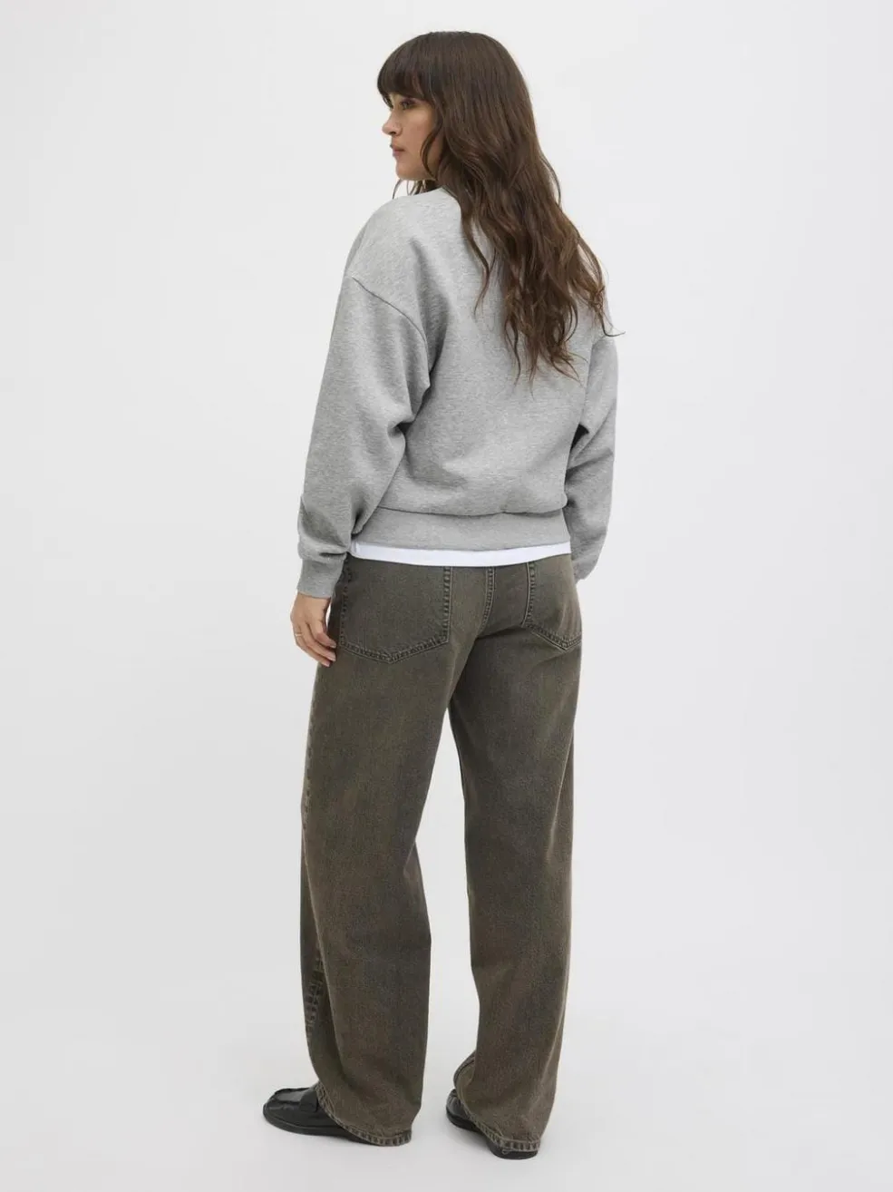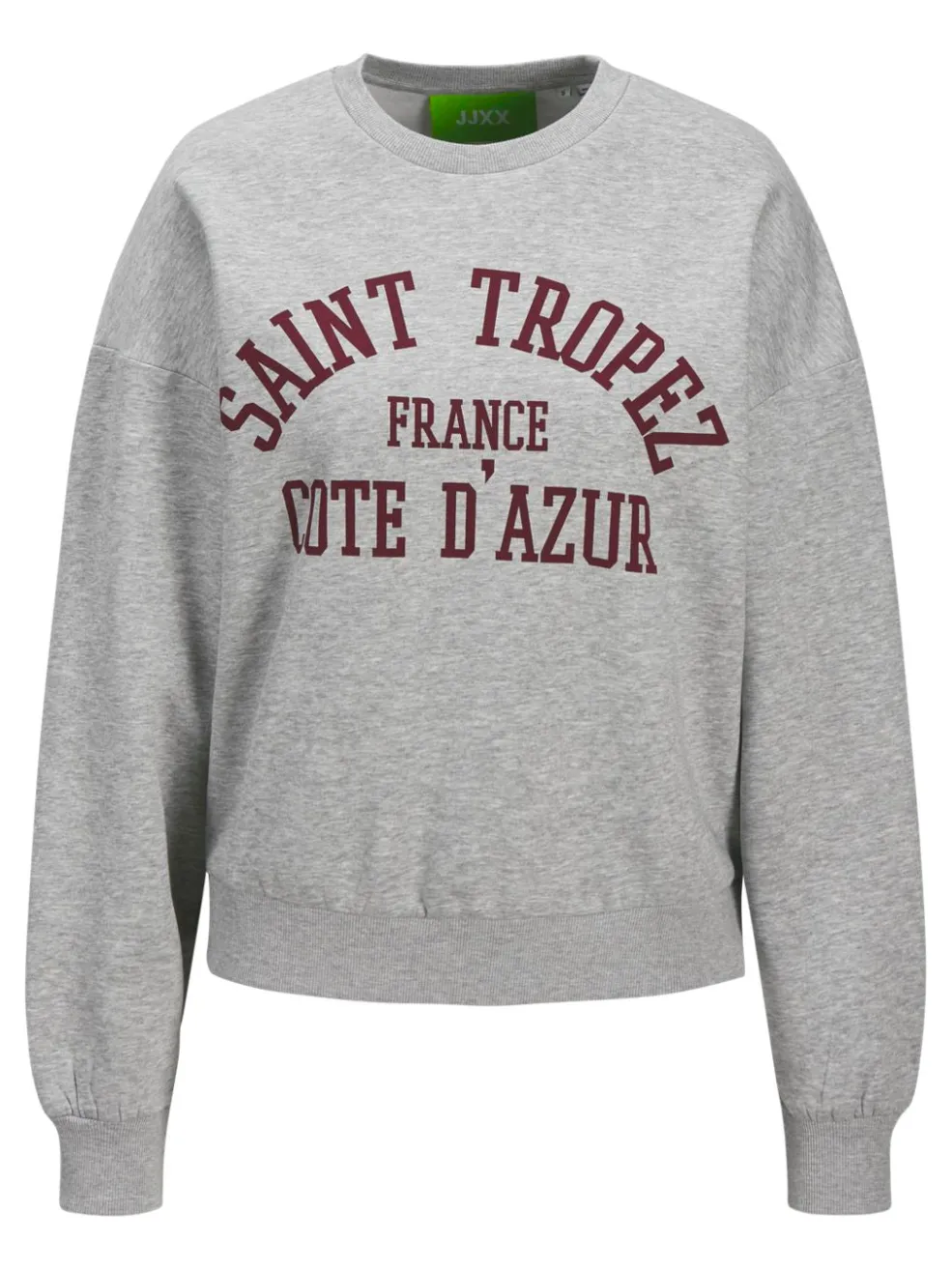 Lys grå sweatshirt fra Jjxx med Saint Tropez-tryk på forsiden. Den har en loose fit-pasform med rund halsudskæring og lange ærmer med elastiske manchetter.