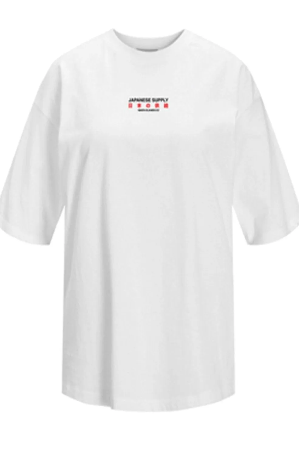 Hvid t-shirt fra Jjxx i børstet jersey. Den har et grafisk design med japansk tema på ryggen og en mindre tekst på brystet i rød.