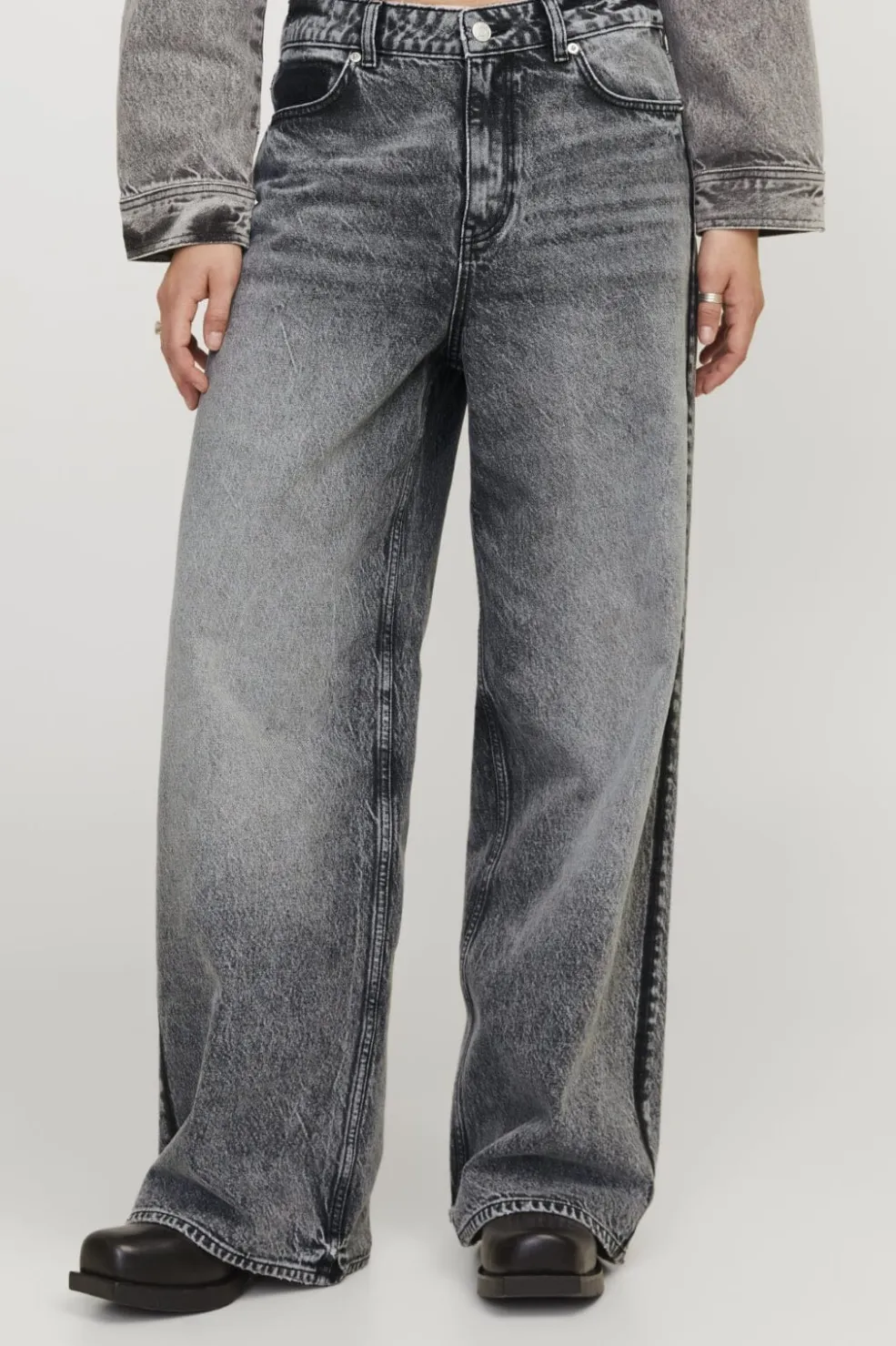 Grå stonewashed jeans fra Jjxx med høj talje og bredt ben. Bukserne har et slidt denim-look med dekorative syninger og praktiske lommer både foran og bagpå.