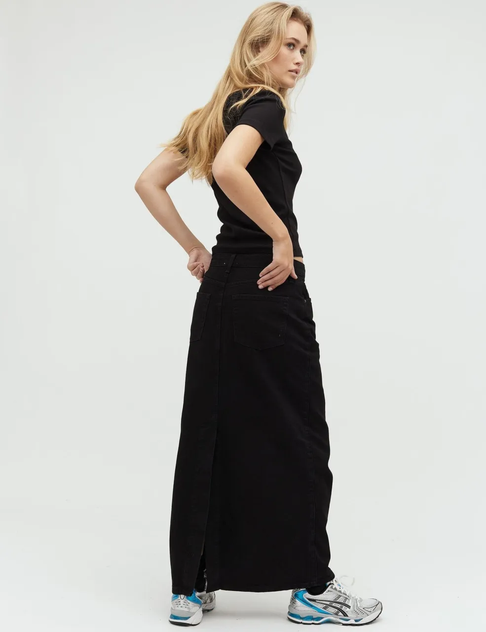 Lang denimnederdel fra Global Funk i farven Black Mix. Nederdelen har en lige pasform med høj talje og knaplukning foran.