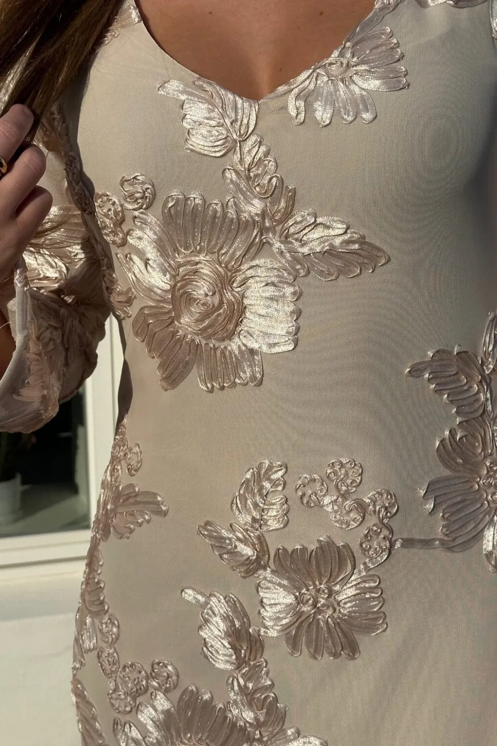 Kortærmet meshkjole fra Noella i cremehvid. Kjolen har broderede blomster over hele designet og en V-halsudskæring. De lange ærmer og lårlængden gør den brugbar året rundt.