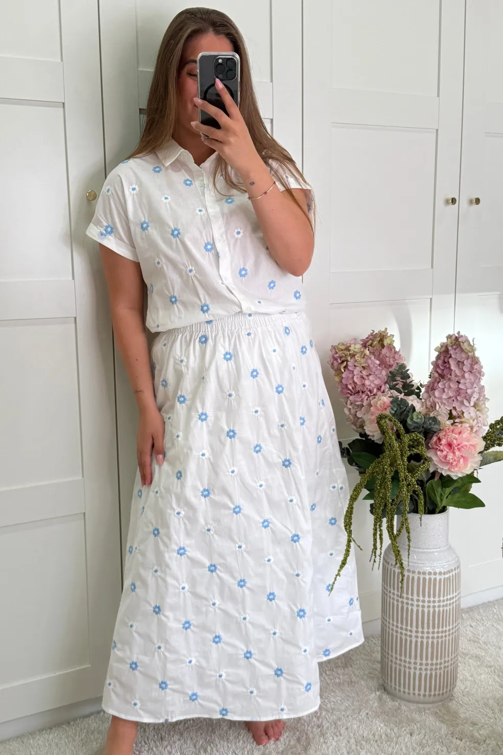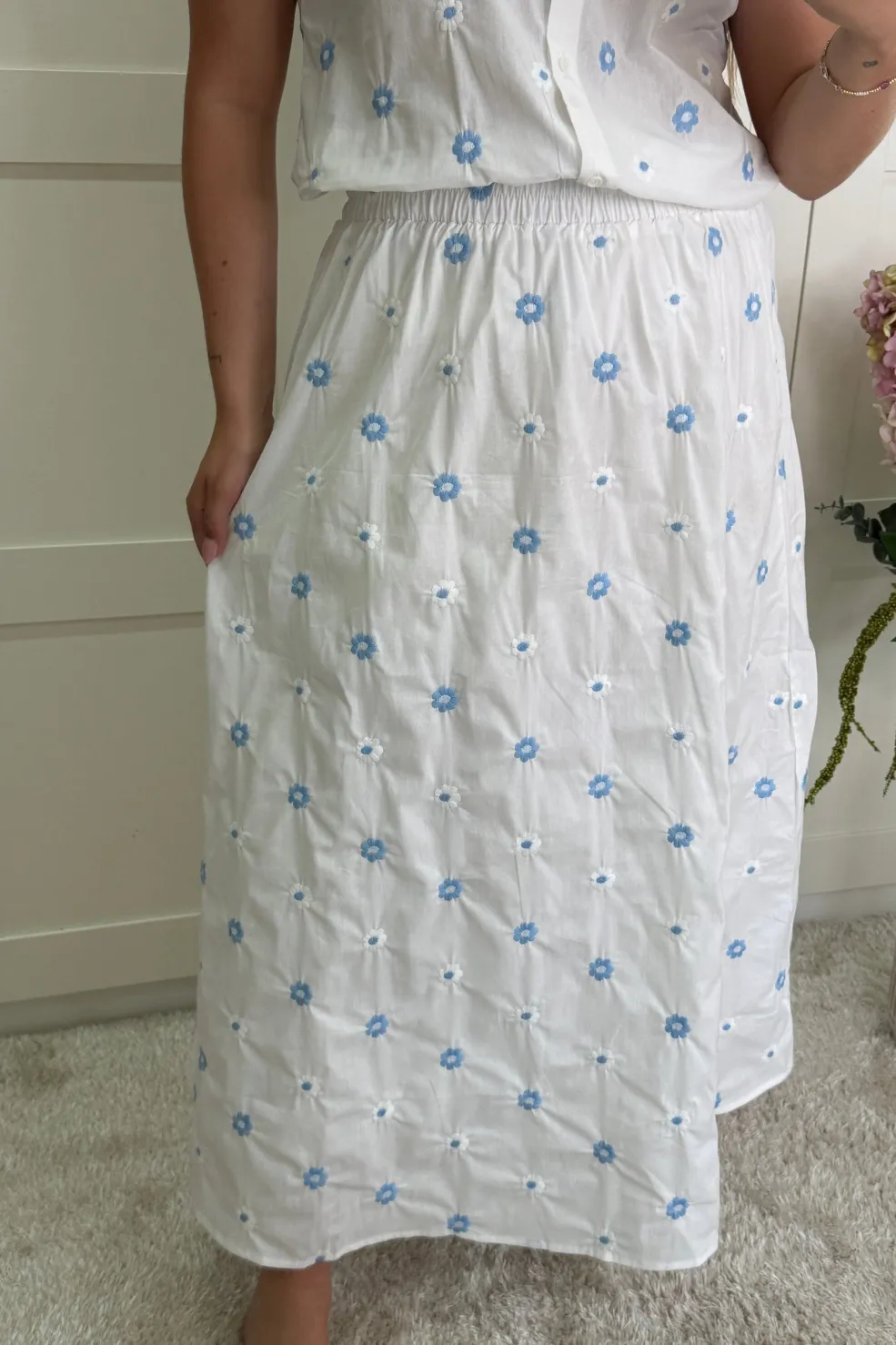 Hvid nederdel fra A-bee med blå blomsterbroderi. Nederdelen har knaplukning foran og en elastisk talje, der giver en behagelig pasform.