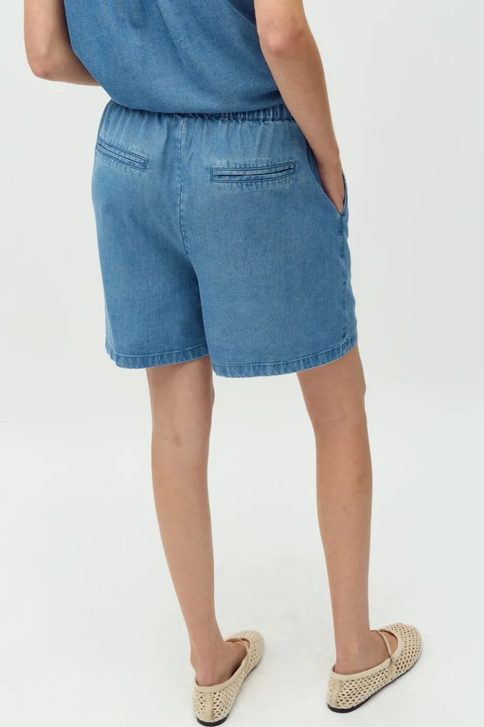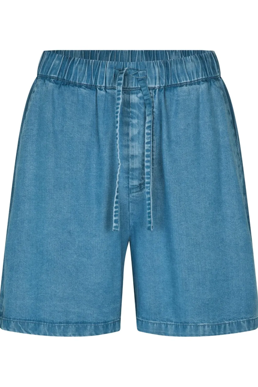 Lyseblå shorts i et blødt og let denimlignende stof. De har en afslappet pasform og er både praktiske til hjemmebrug og hverdagens gøremål.