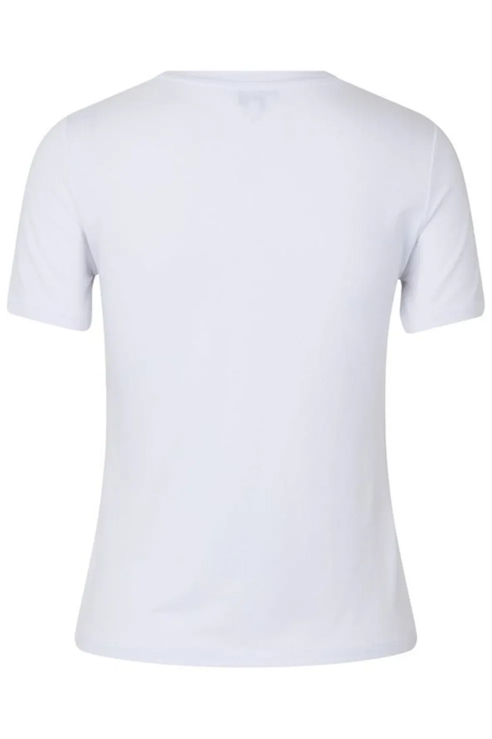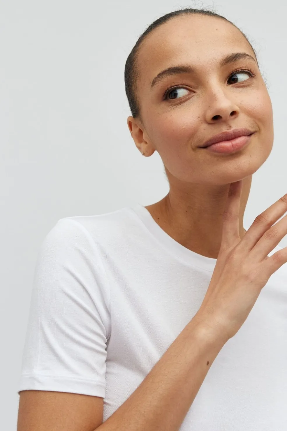 Hvid t-shirt fra MbyM med rund halsudskæring og korte ærmer. T-shirten har en slim fit-pasform og er lavet af blødt TENCEL-materiale.