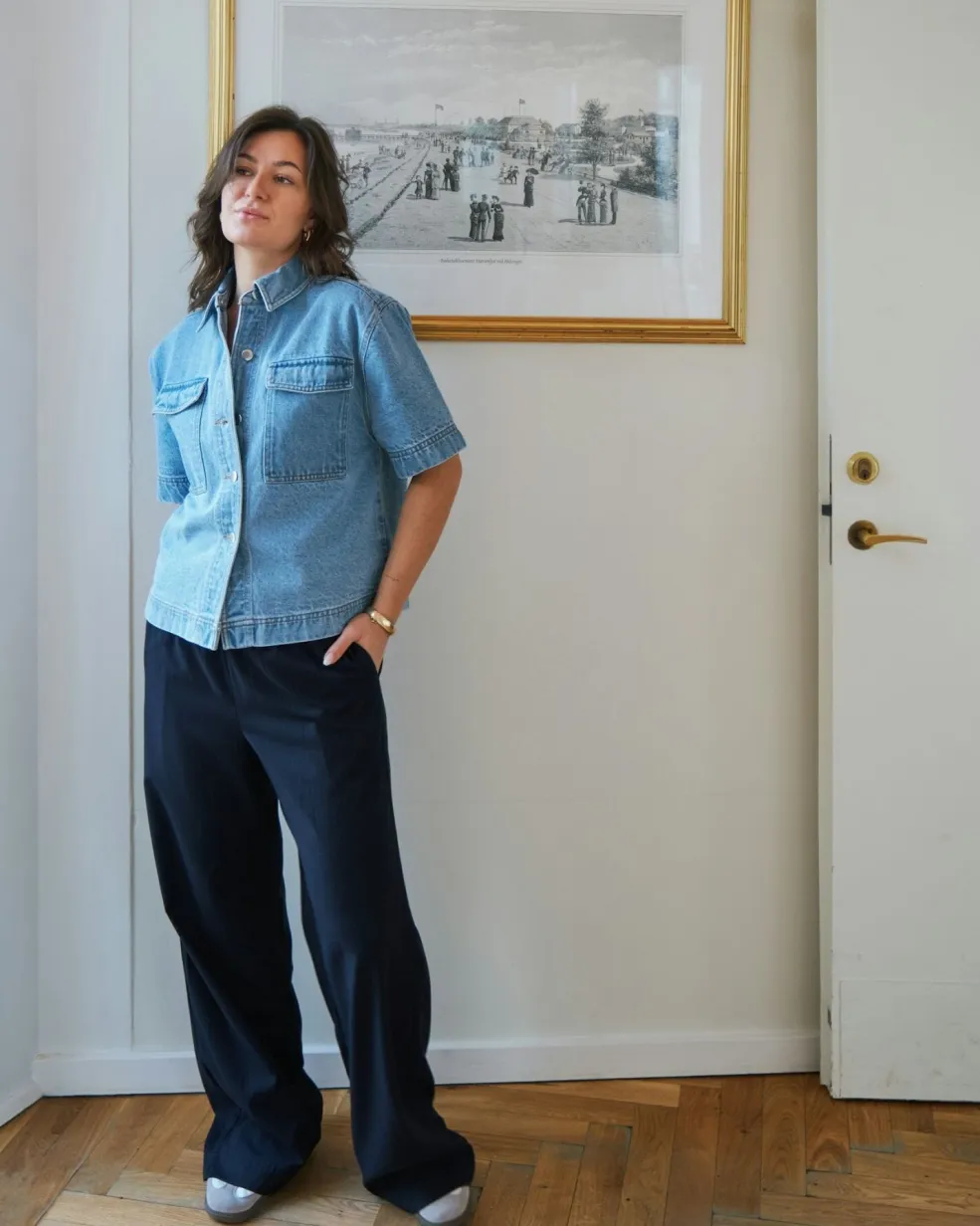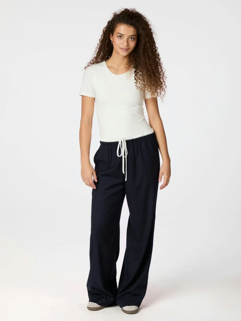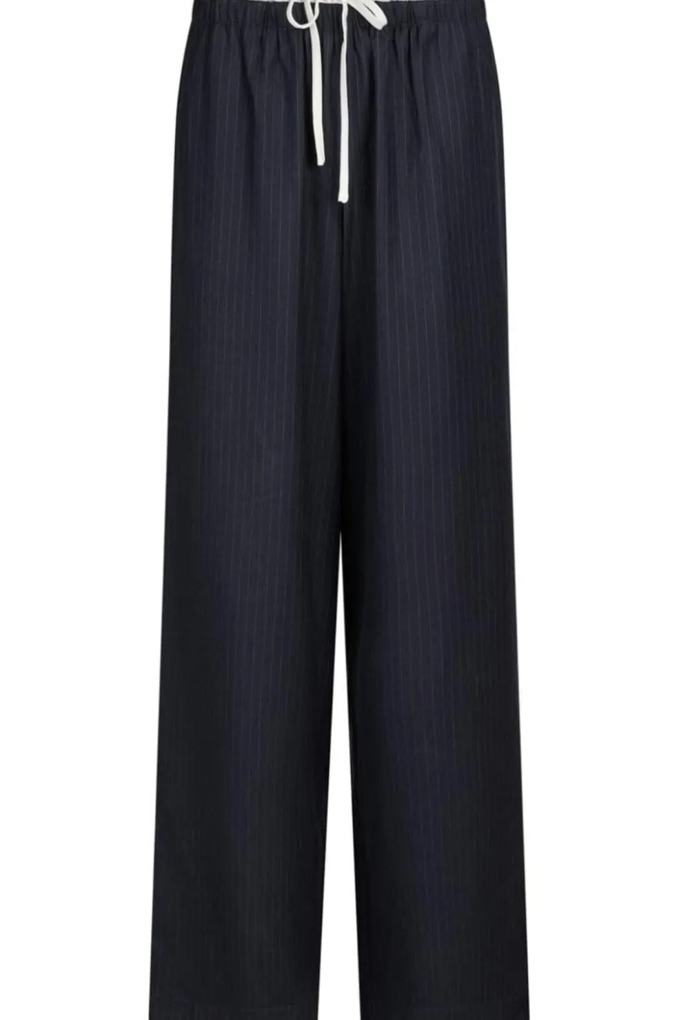 Mørkeblå bukser fra Neo Noir med pinstriber. De højtaljede bukser har en løs pasform og går helt ned til gulvet. Snøren i taljen kan justeres efter behov.