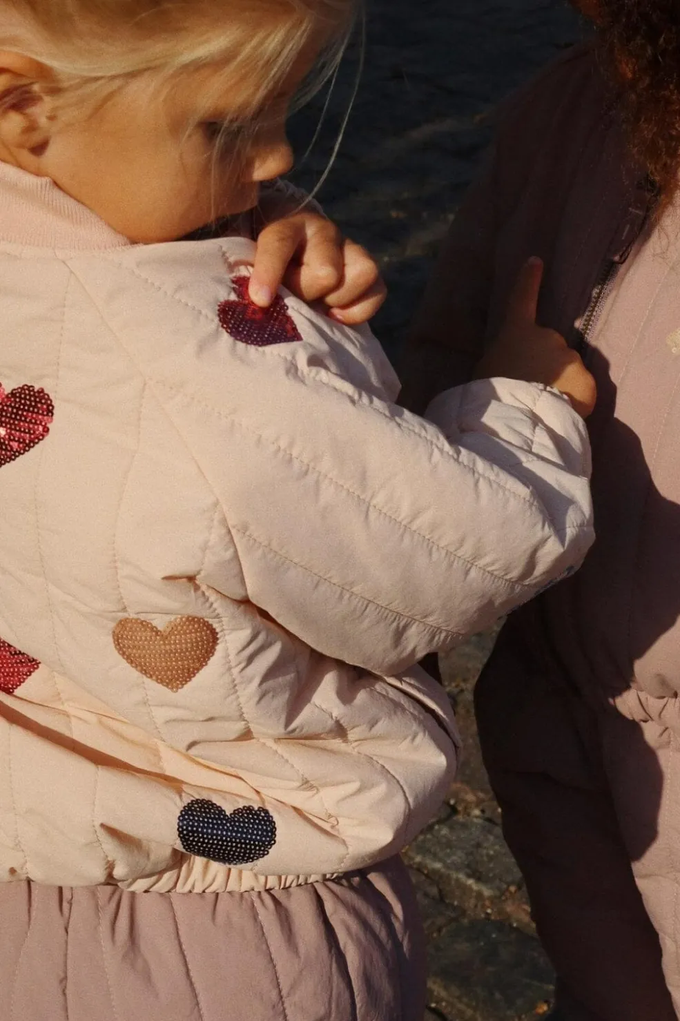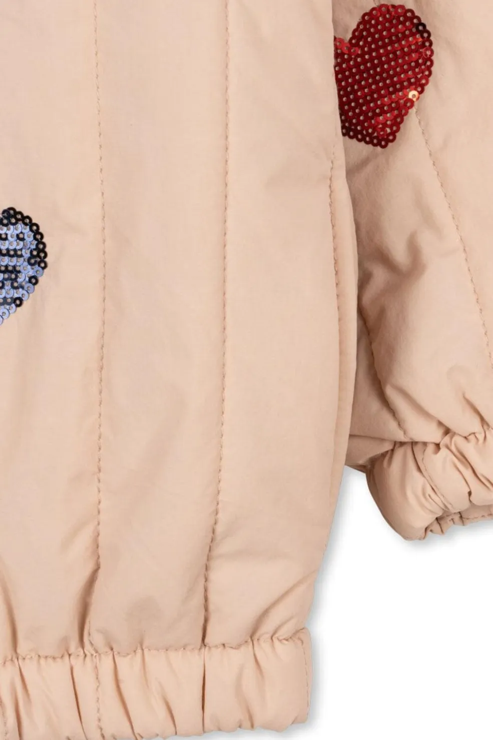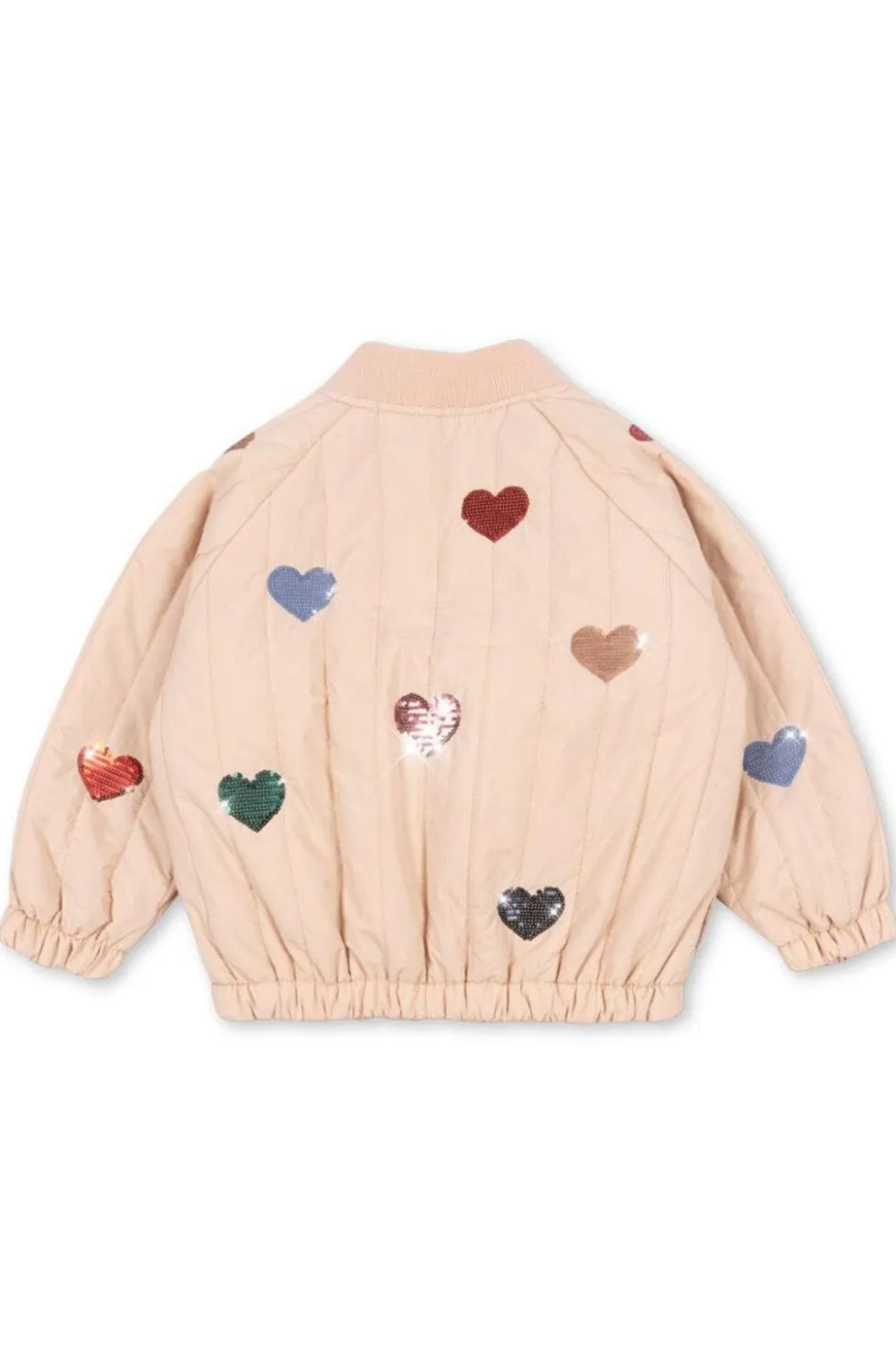 Bomberjakke fra Konges Sløjd i lyserød og beige nuance med hjerteformede pailletter i forskellige farver på forsiden.