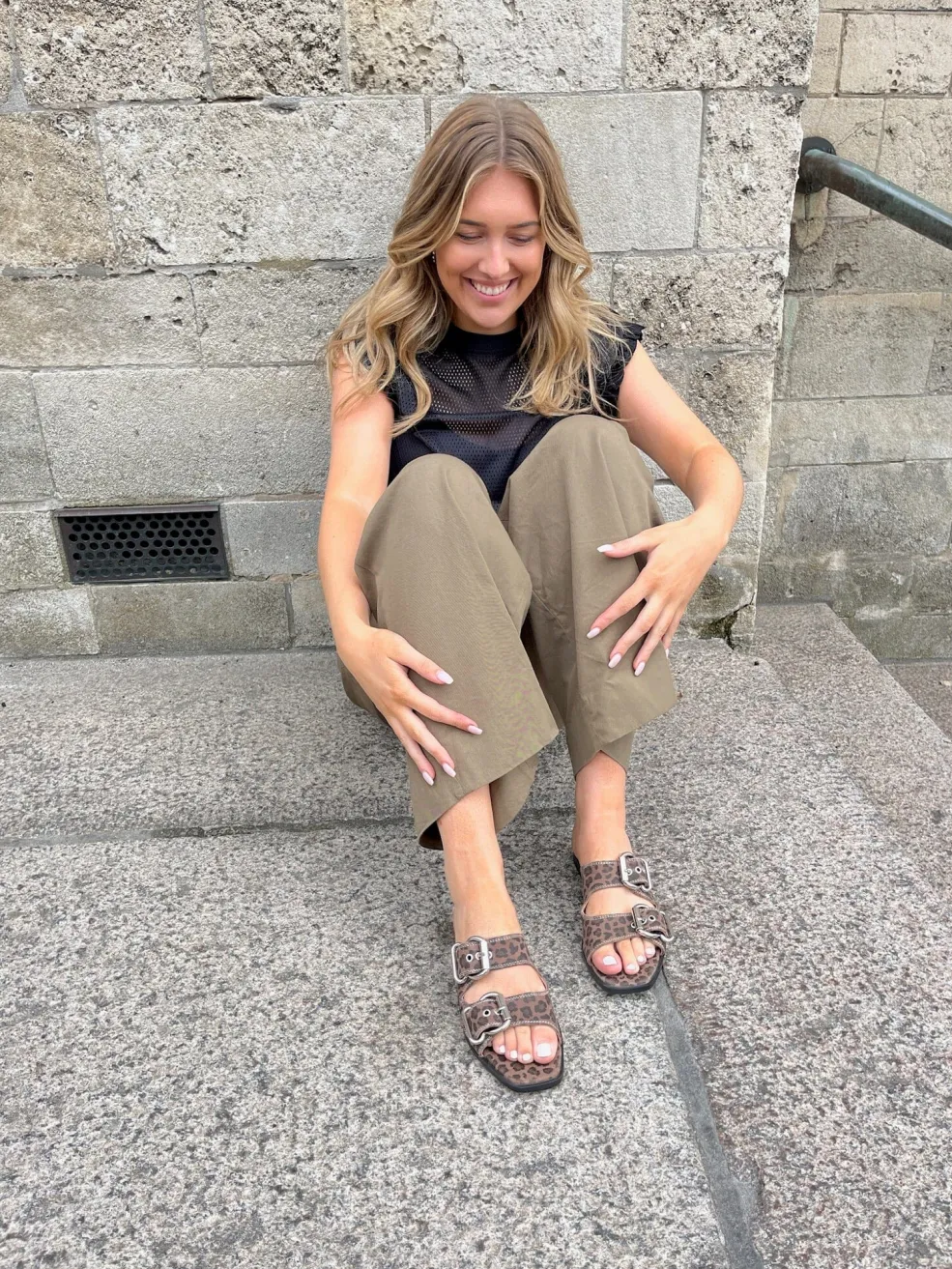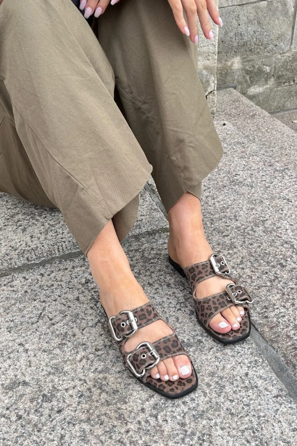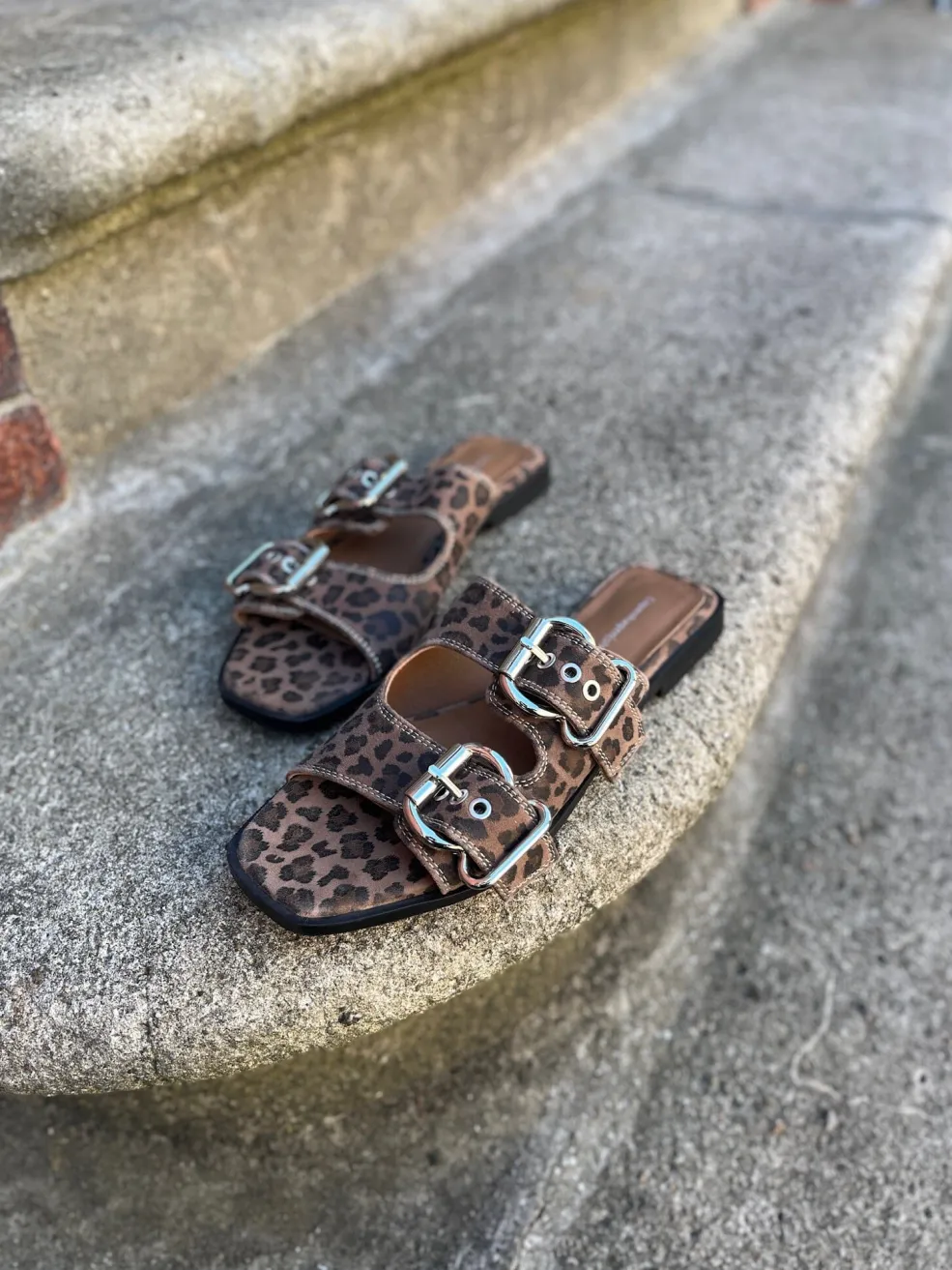 Sandal fra Copenhagen Shoes med brunt og sort leopardmønster. Den flade sandal har to spænder og en åben tå, som gør den nem at justere til foden.