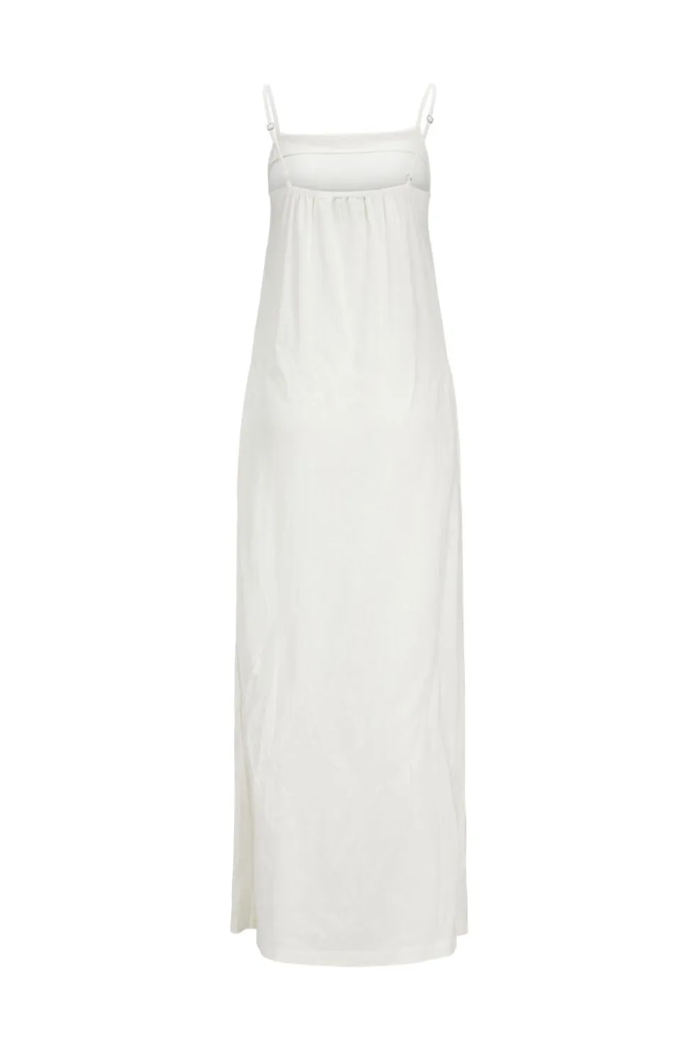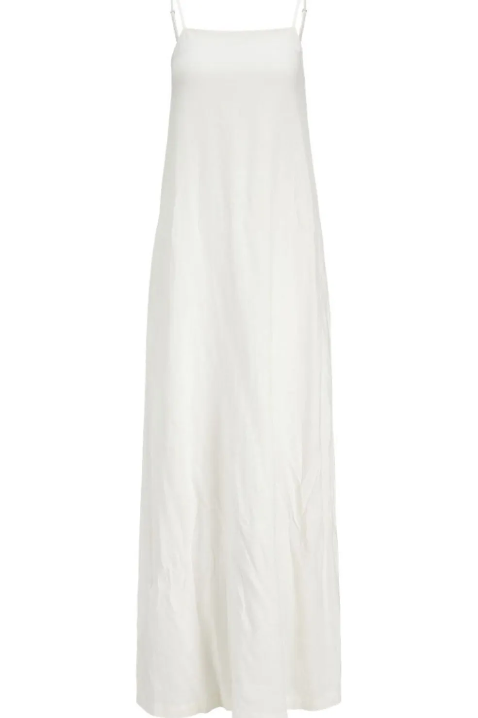 Lang hvid sommerkjole fra Jjxx med tynde spaghettistropper og firkantet halsudskæring. Den løse pasform og det lette materiale gør kjolen behagelig at have på.