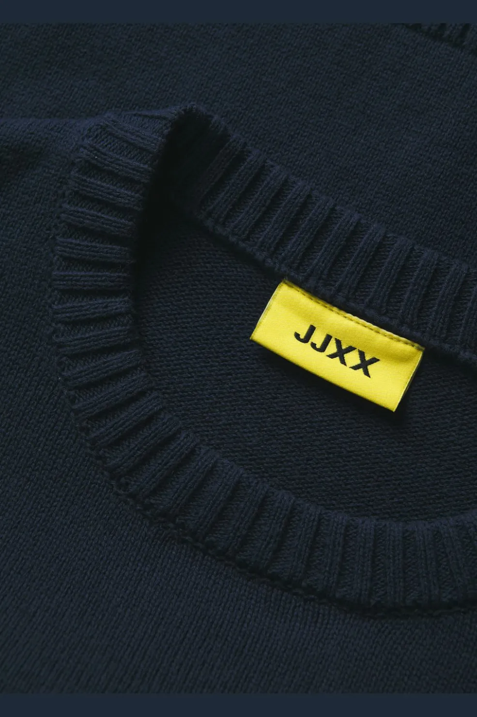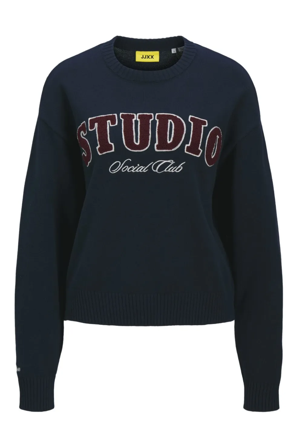 Mørkeblå striktrøje fra Jjxx med broderet STUDIO Social Club-tekst på fronten. Den har en løs pasform og er lavet af fladstrik med ribkanter ved ærmerne og bunden.