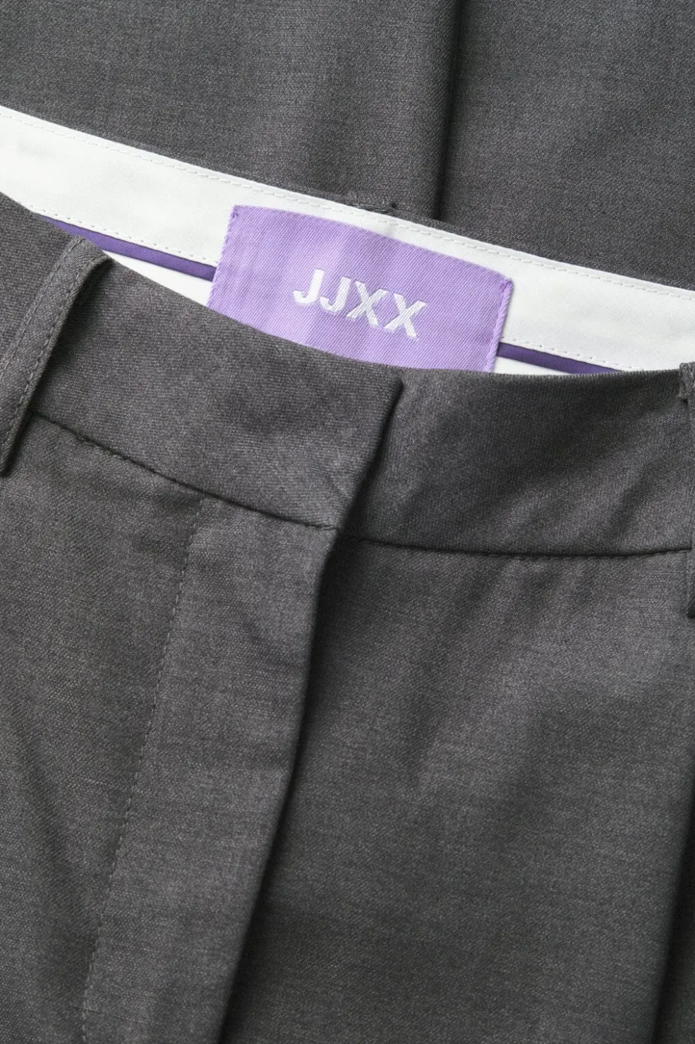 Mørkegrå bukser fra Jjxx i en slidstærk, vævet kvalitet. Bukserne har høj talje og wide leg-fit med lynlåslukning. De passer til både afslappede og formelle anledninger.