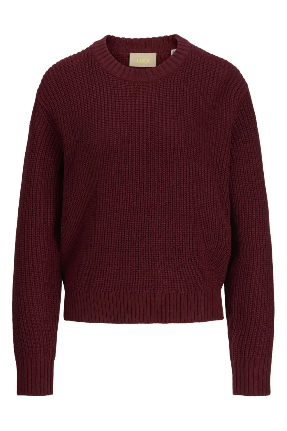 Bordeauxfarvet striktrøje fra JJXX med en klassisk crew neck-udskæring. Den løse pasform og det ribbede design giver god bevægelsesfrihed i hverdagen.