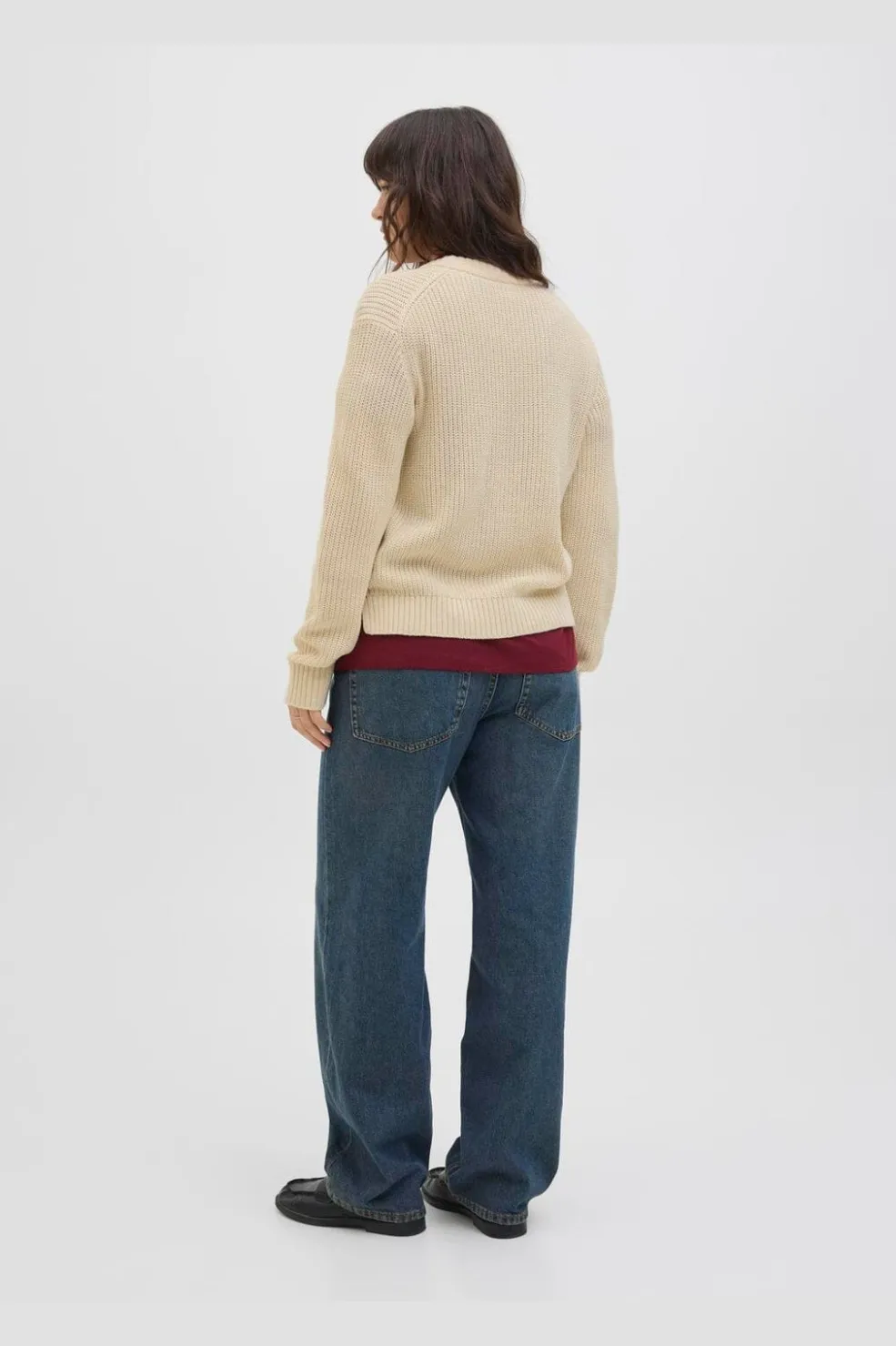 Cremefarvet striktrøje fra Jjxx med rund halsudskæring og lange ærmer. Trøjen har en løs pasform og er lavet i fladstrik med ribkanter ved ærmerne og nederst.