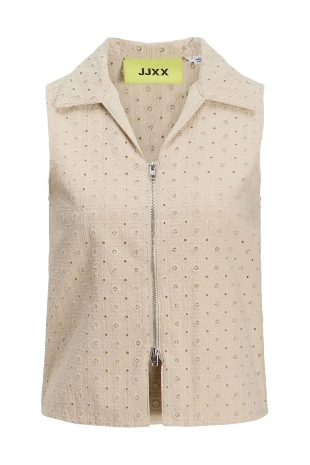 Ærmeløs top fra Jjxx i en lys cremefarvet nuance. Toppen har broderie anglaise-mønster med små blomster og øjehuller, lynlåslukning foran og en klassisk skjortekrave.