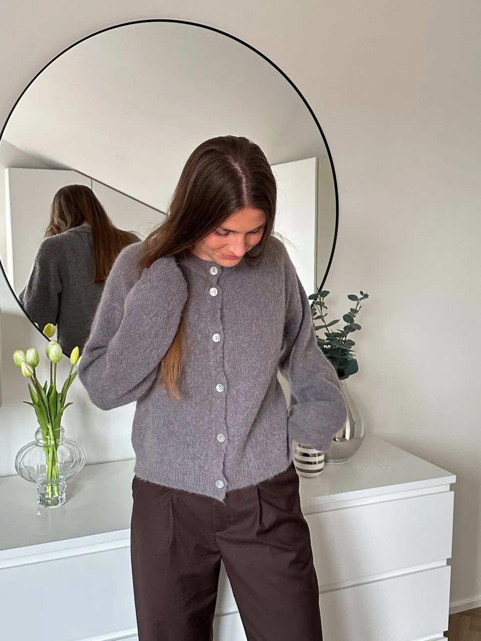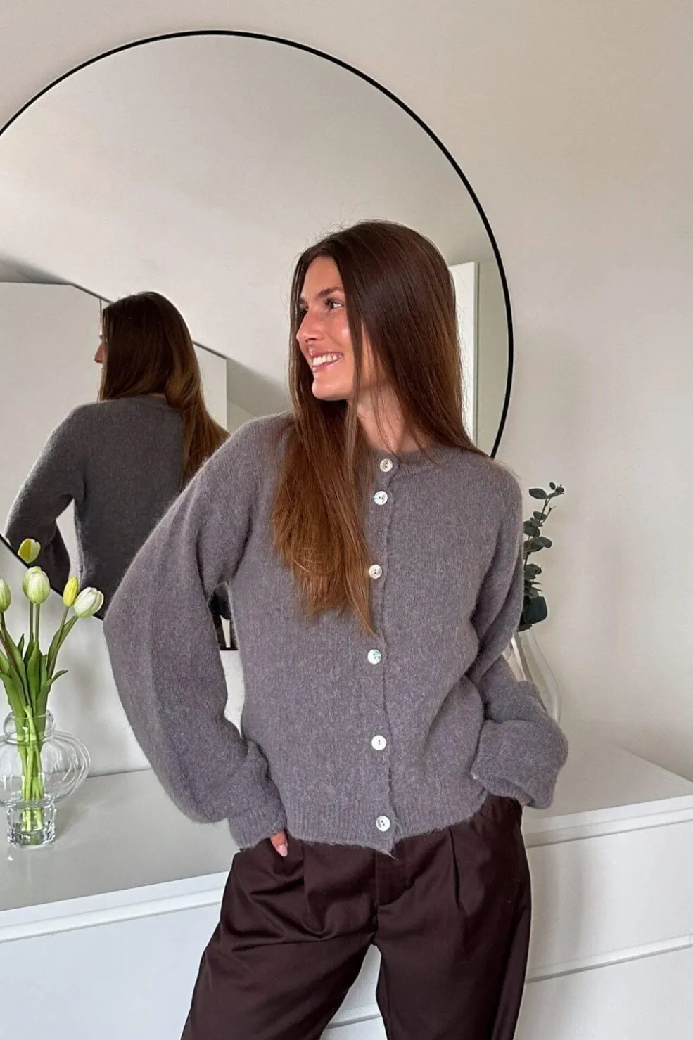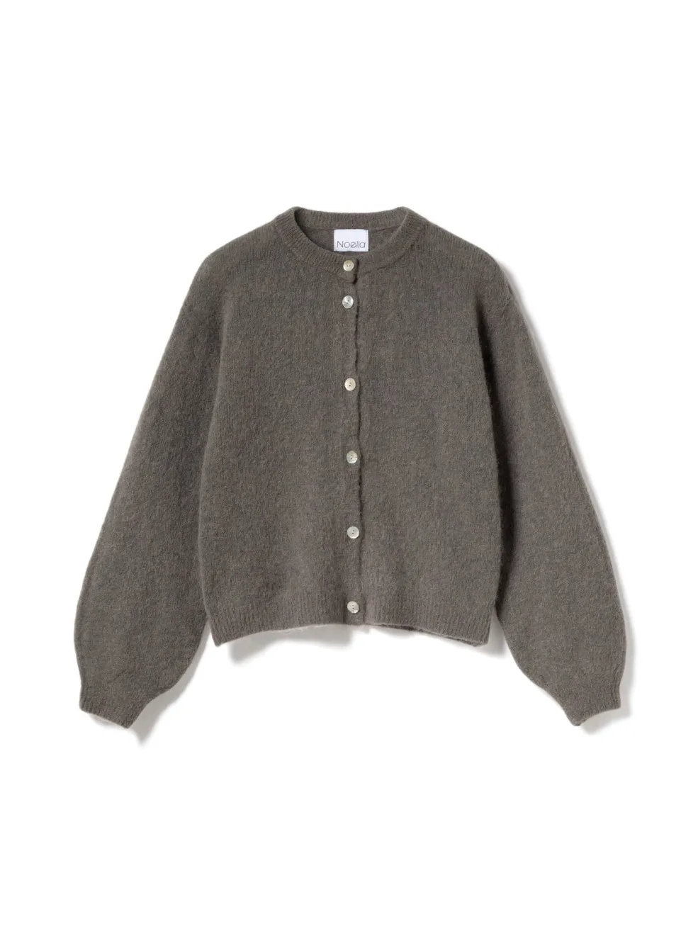 Strikket cardigan fra Noella i kaffebrun. Den har rund hals, knapper foran og brede ærmer med let puf. Materialet er blødt og fluffy med en varm fornemmelse.