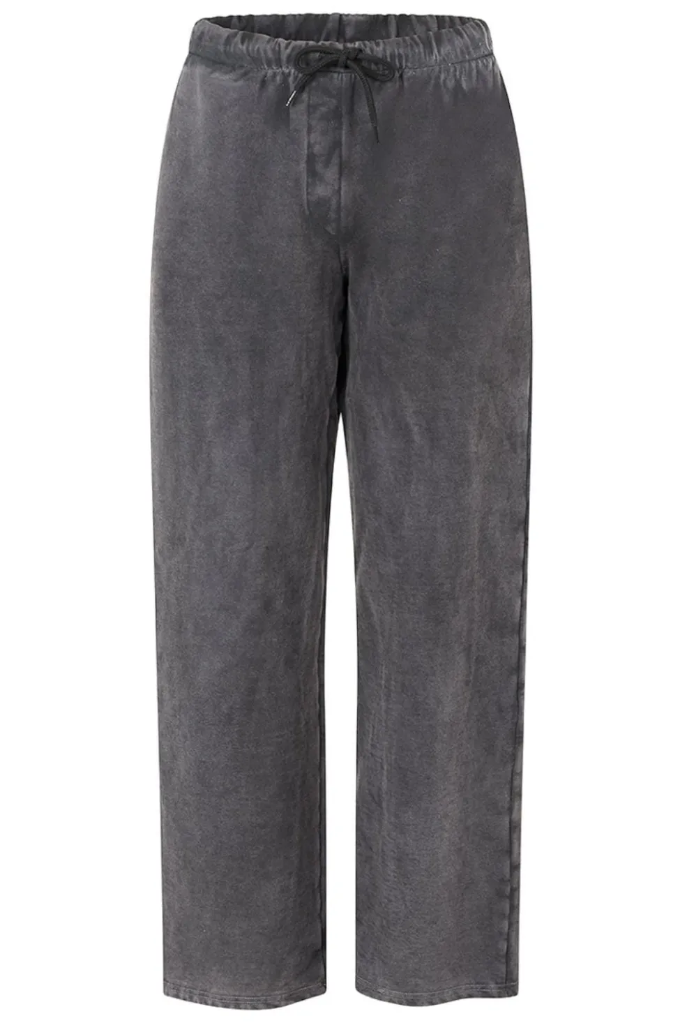 Løse bukser fra Modström i vasket sort. Bukserne har en afslappet pasform med brede ben og sidelommer. De er lavet af økologisk bomuld med elastik og bindebånd i taljen.