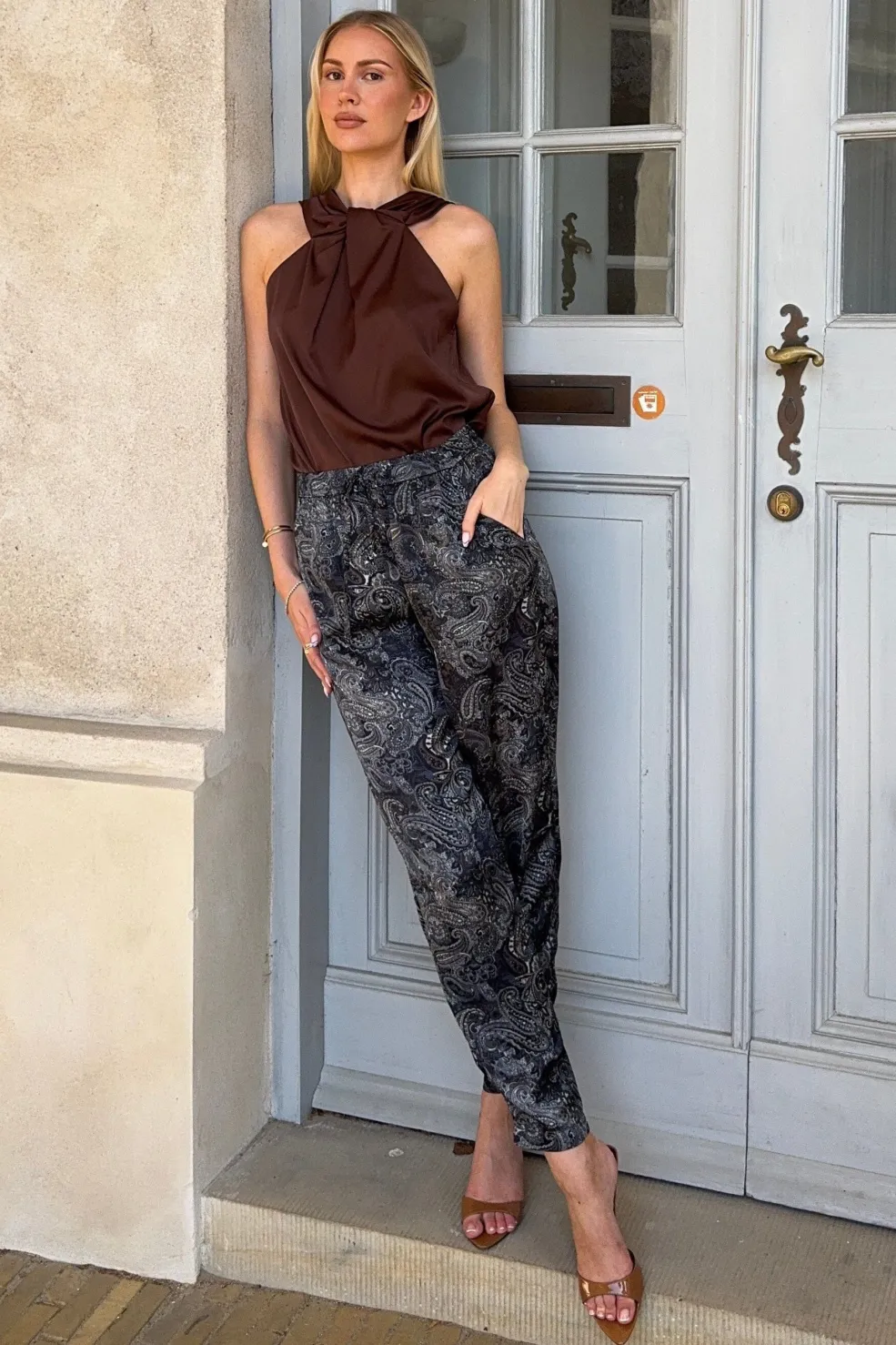 Bukser fra Karmamia med paisley-mønster i grå og sorte nuancer. Bukserne har en elastisk talje med snørelukning og går til anklen.