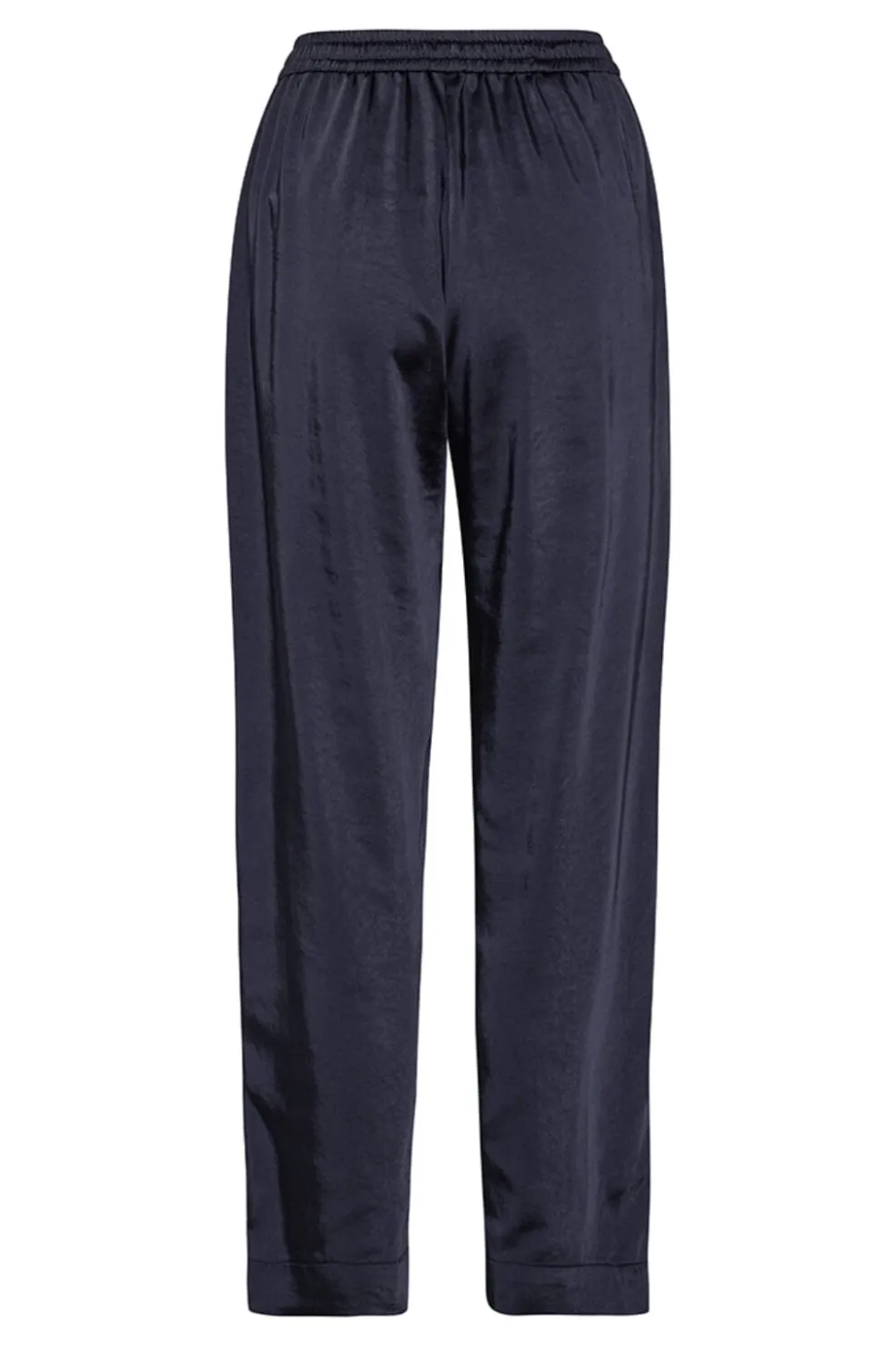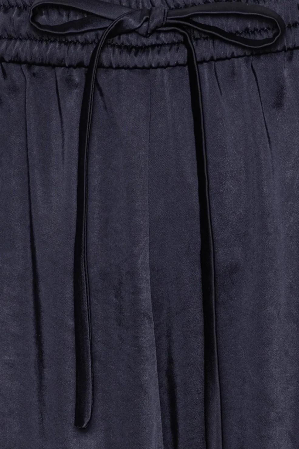 Mørkeblå bukser fra Karmamia i skinnende satin med elastisk talje og bindebånd. Den løse pasform og det bløde materiale giver god bevægelsesfrihed.