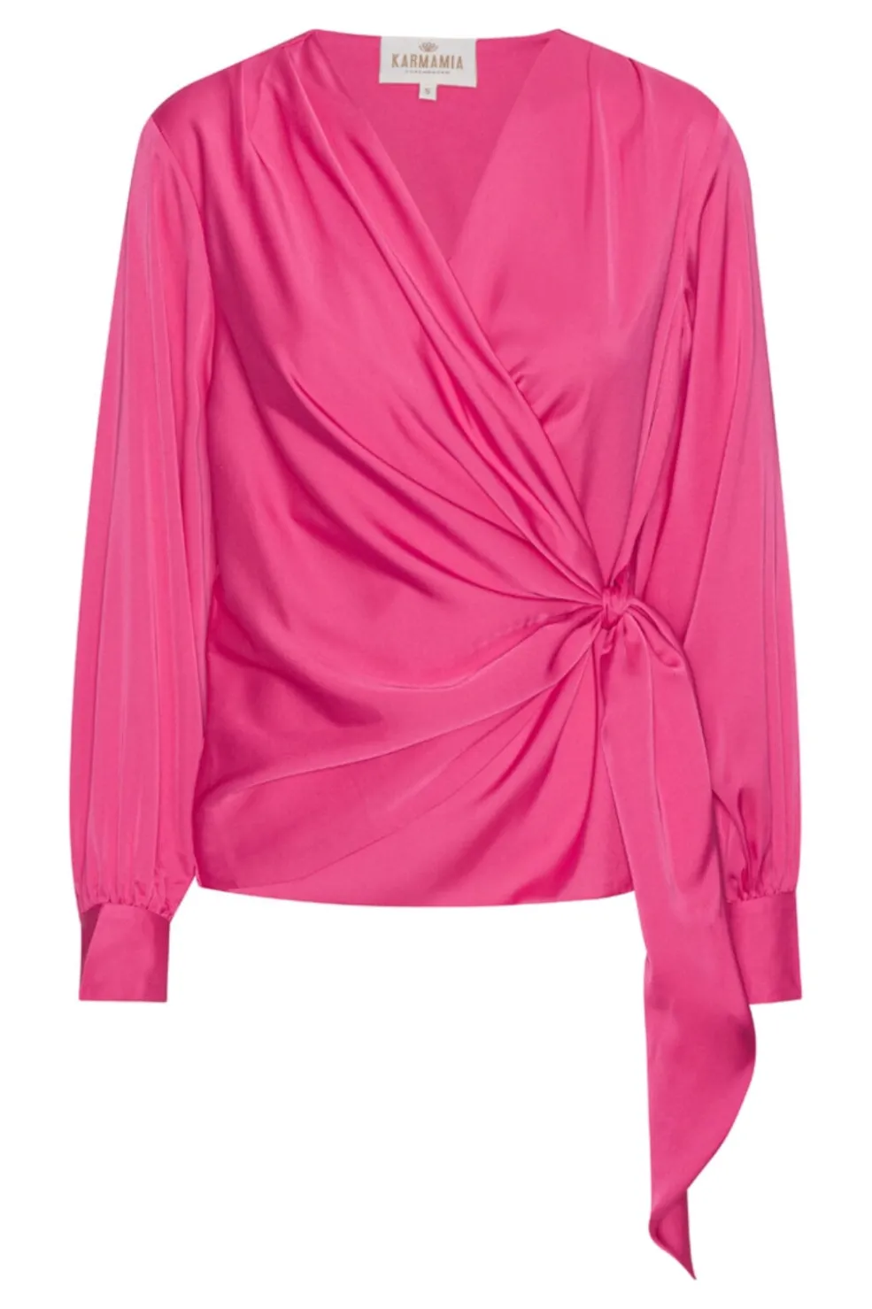 Pink slå-om-bluse fra Karmamia med V-udskæring og bindebånd i siden. Blusen har lange ærmer med manchetter og er fremstillet i blank satin.