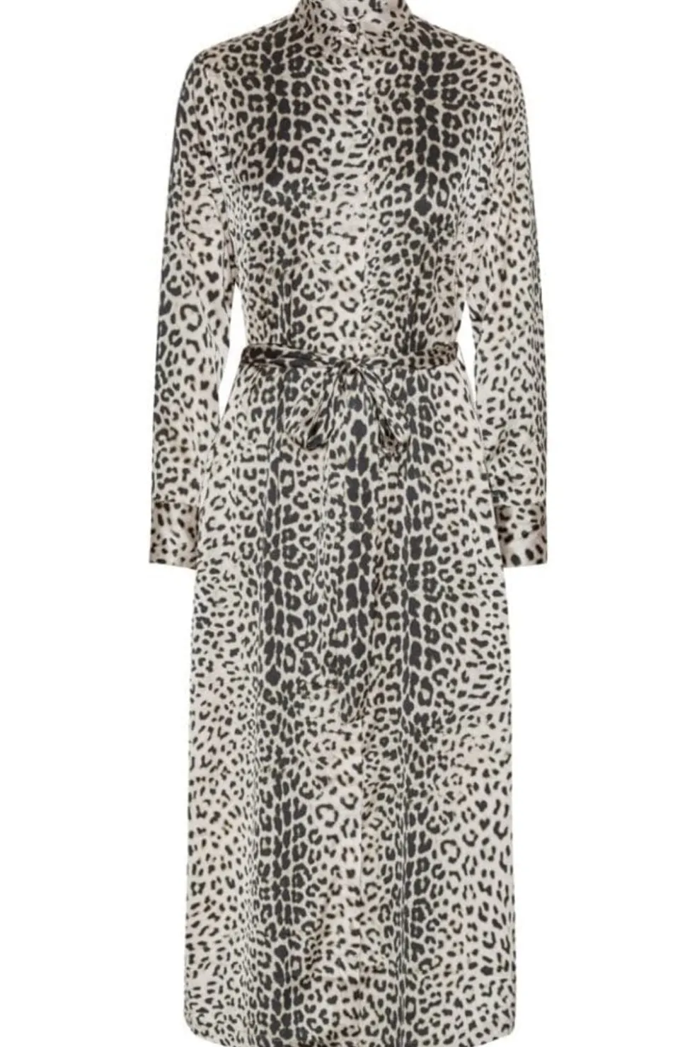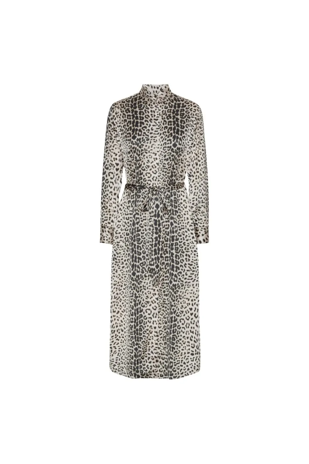 Skjortekjole fra Karmamia i beige med sort leopardprint. Kjolen har lange ærmer, skjortekrave og bindebånd i taljen. Den går til midt på læggen.