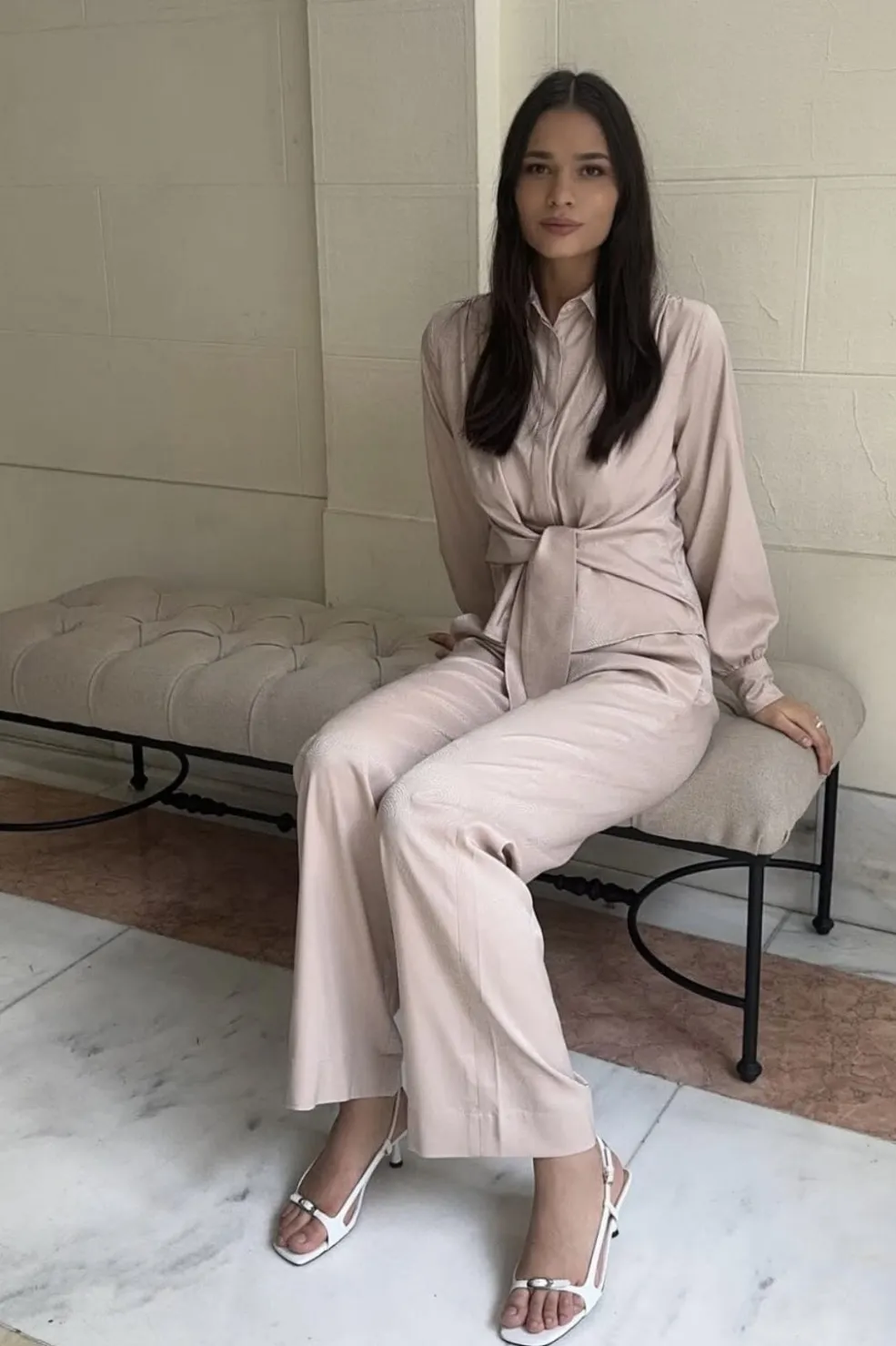 Beige bukser fra Karmamia med snøre i taljen. Bukserne har en afslappet pasform og er fremstillet af miljøvenlige materialer med en blød overflade.