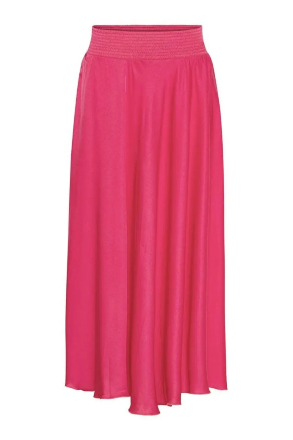 Pink nederdel i læglængde med smocktalje og flæser. Den bløde polyester giver et let og flydende fald med god bevægelse.