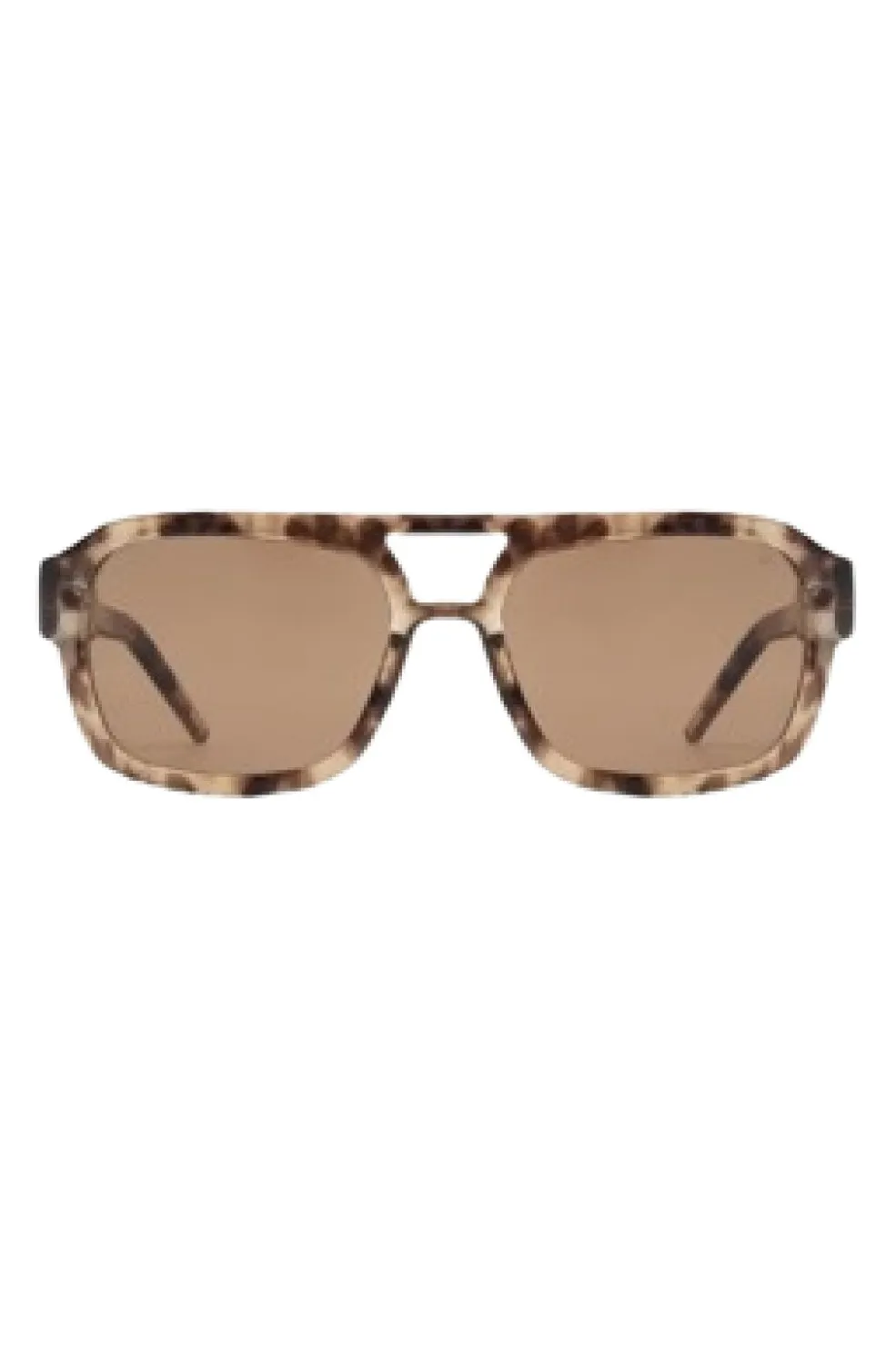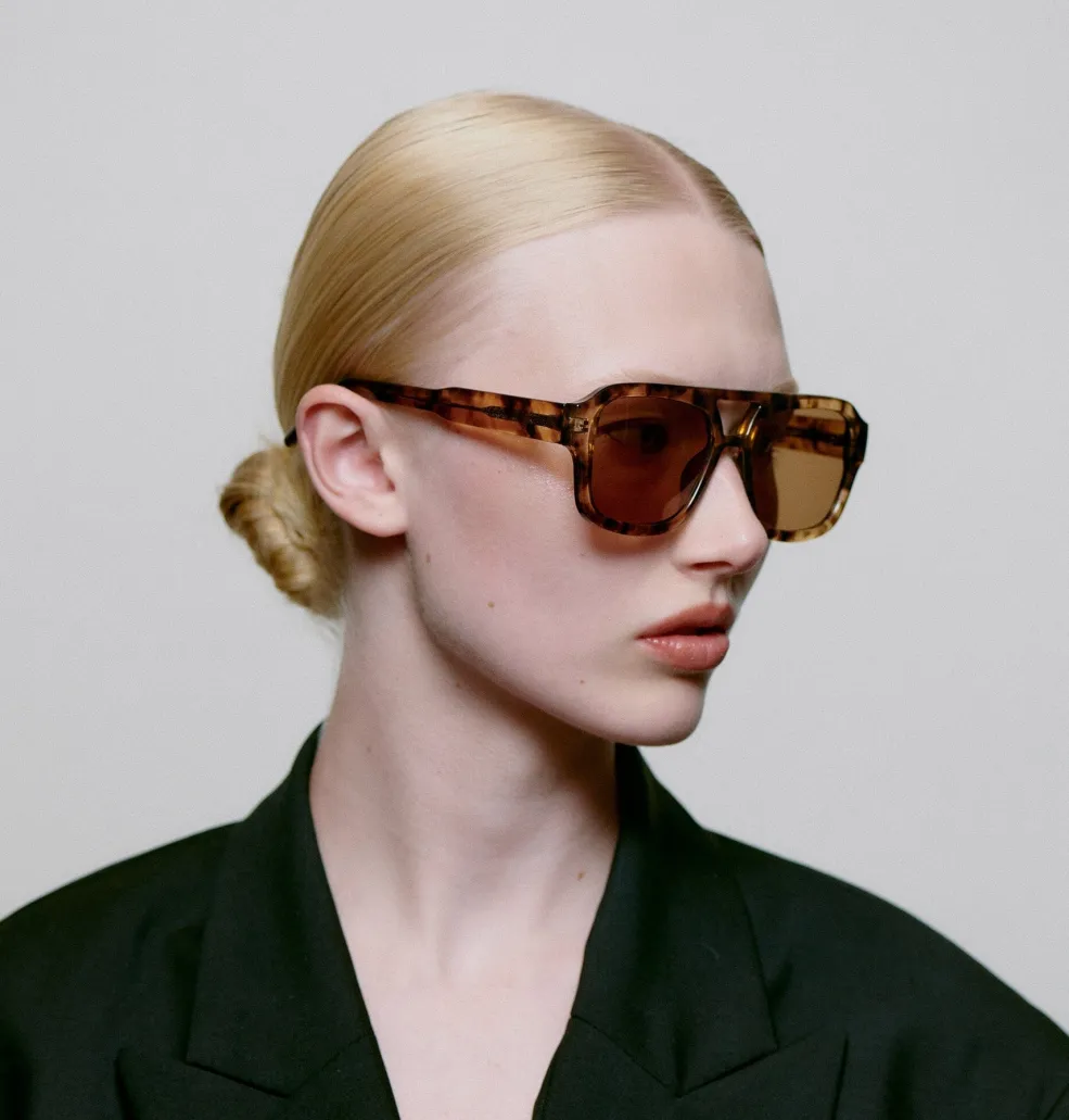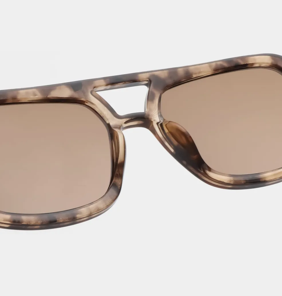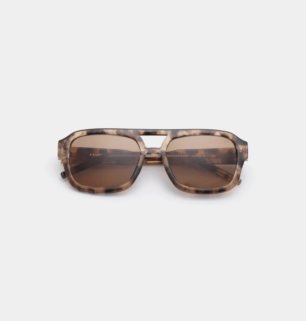 Solbriller fra A. Kjærbede med brun aviator-stel i polycarbonat. Brillen har brune linser med UV 400-beskyttelse og er udstyret med formbare stænger med metalkerne.