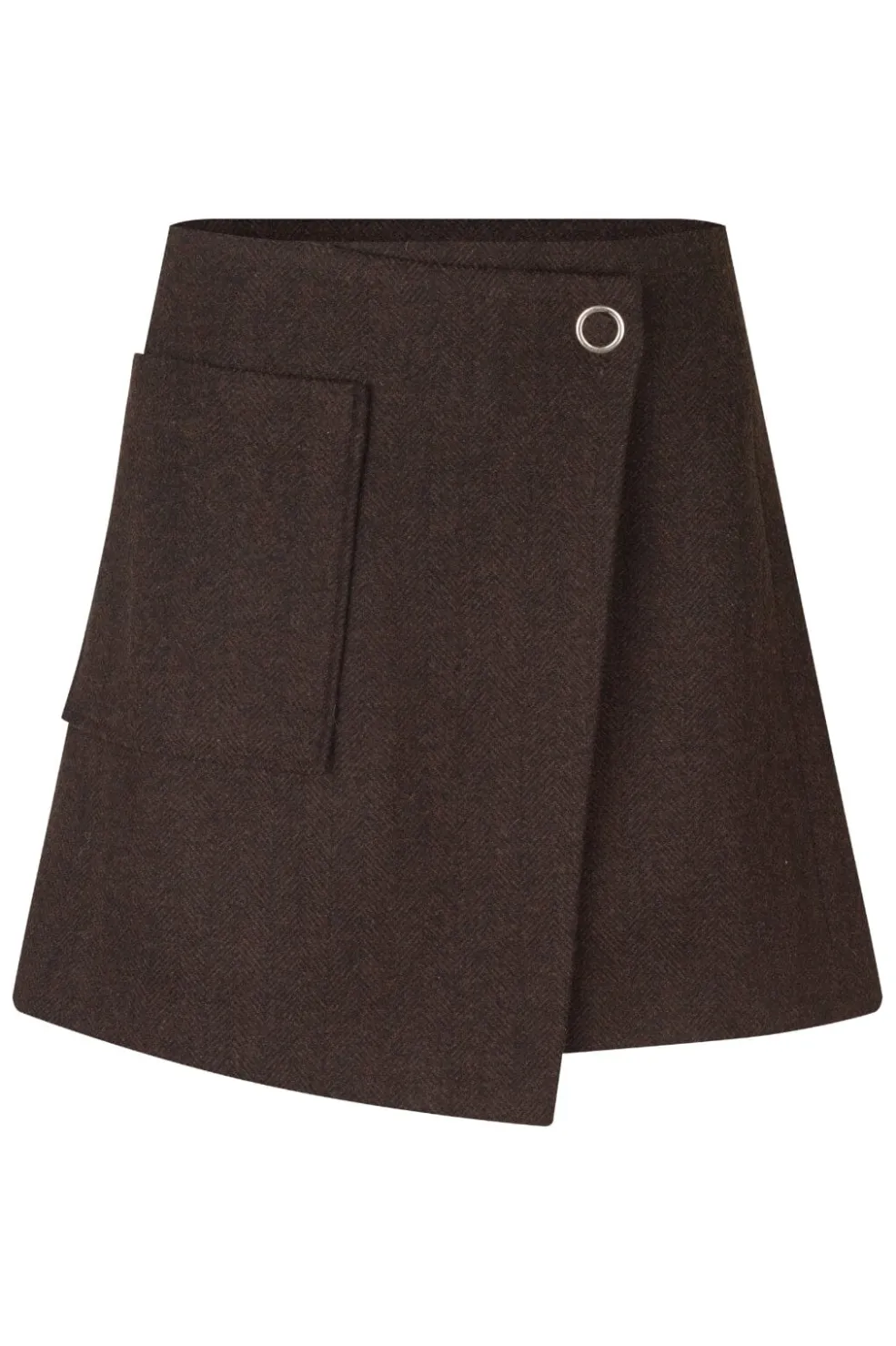 Nederdel fra MbyM i brun-sort twill med fiskebenmønster. Passer til både casual og formelle lejligheder med en alsidig stil.