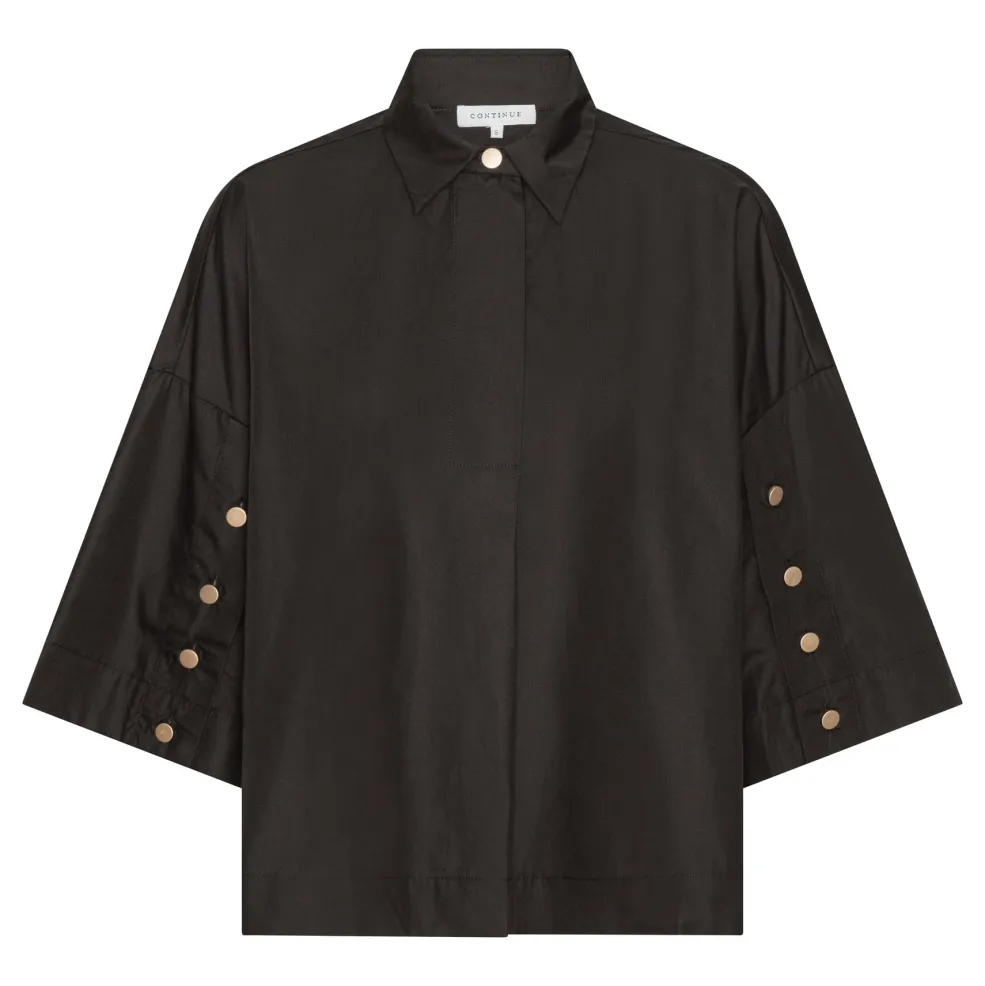 Sort skjorte fra Continue med en løs pasform og 3/4 ærmer. Skjorten har knapdetaljer på ærmerne og en klassisk krave.