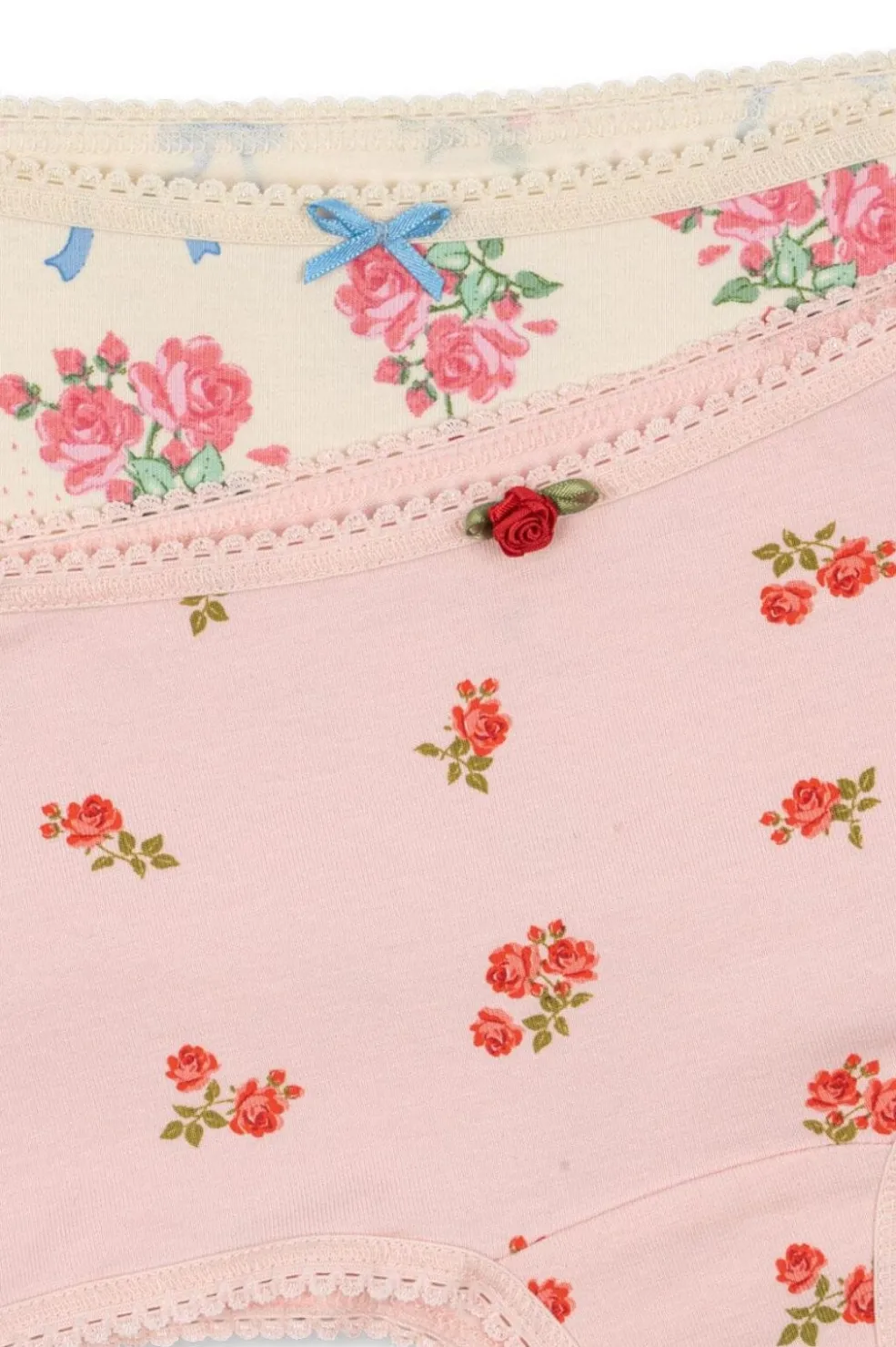 To hipstertrusser fra Konges Sløjd i et sæt. Den ene er rosa pink med små røde blomster, den anden er cremefarvet med rosa blomster og blå sløjfer.