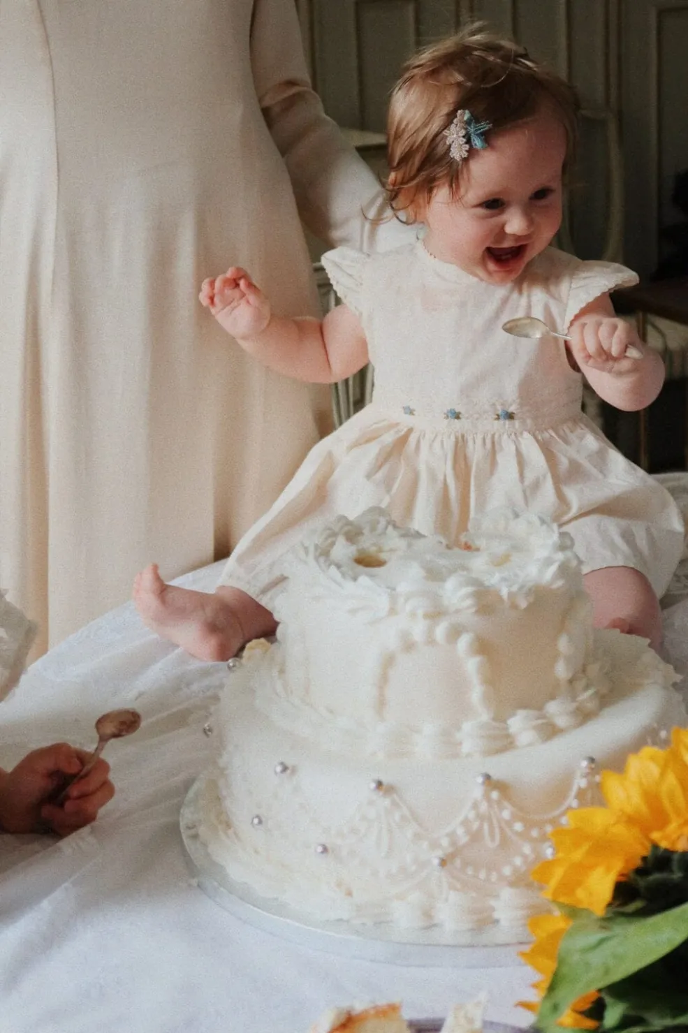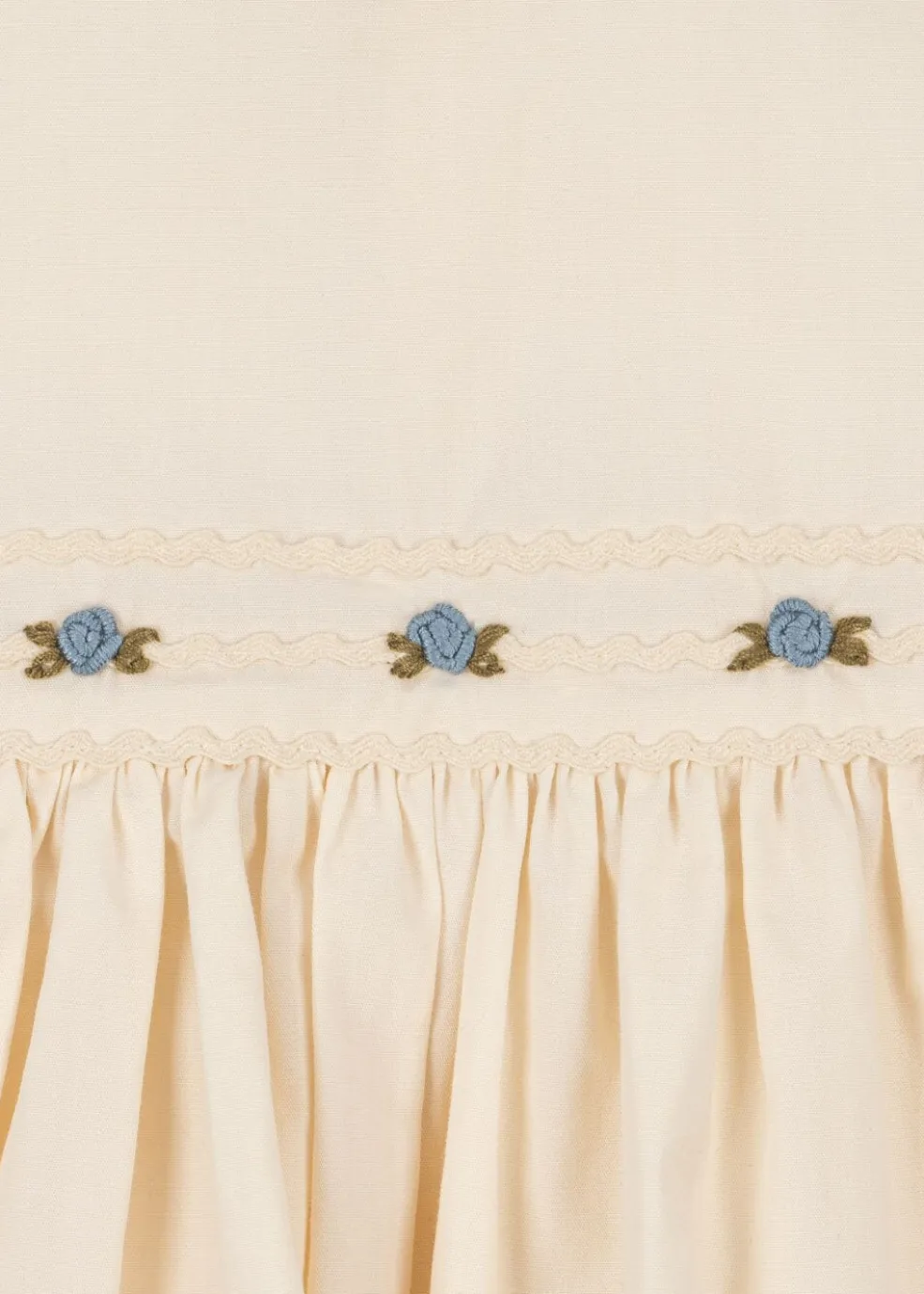 Et festsæt i lys eggnog-farve fra Konges Sløjd med kjole og bloomers. Sættet har fine flæser ved skuldrene, blonder og broderede detaljer.