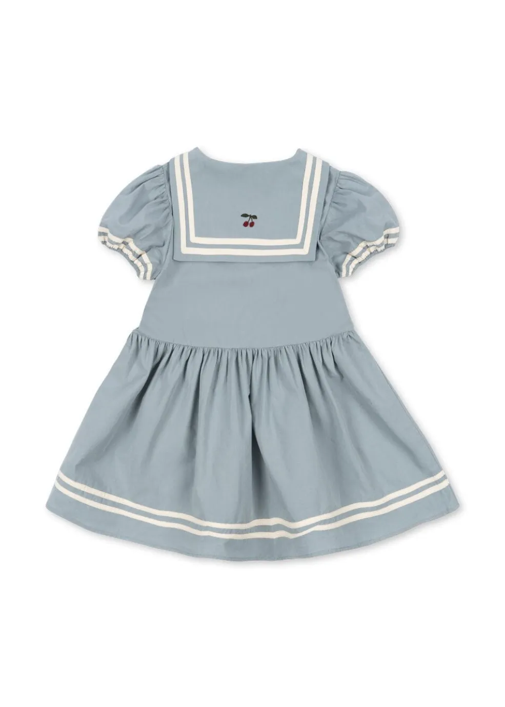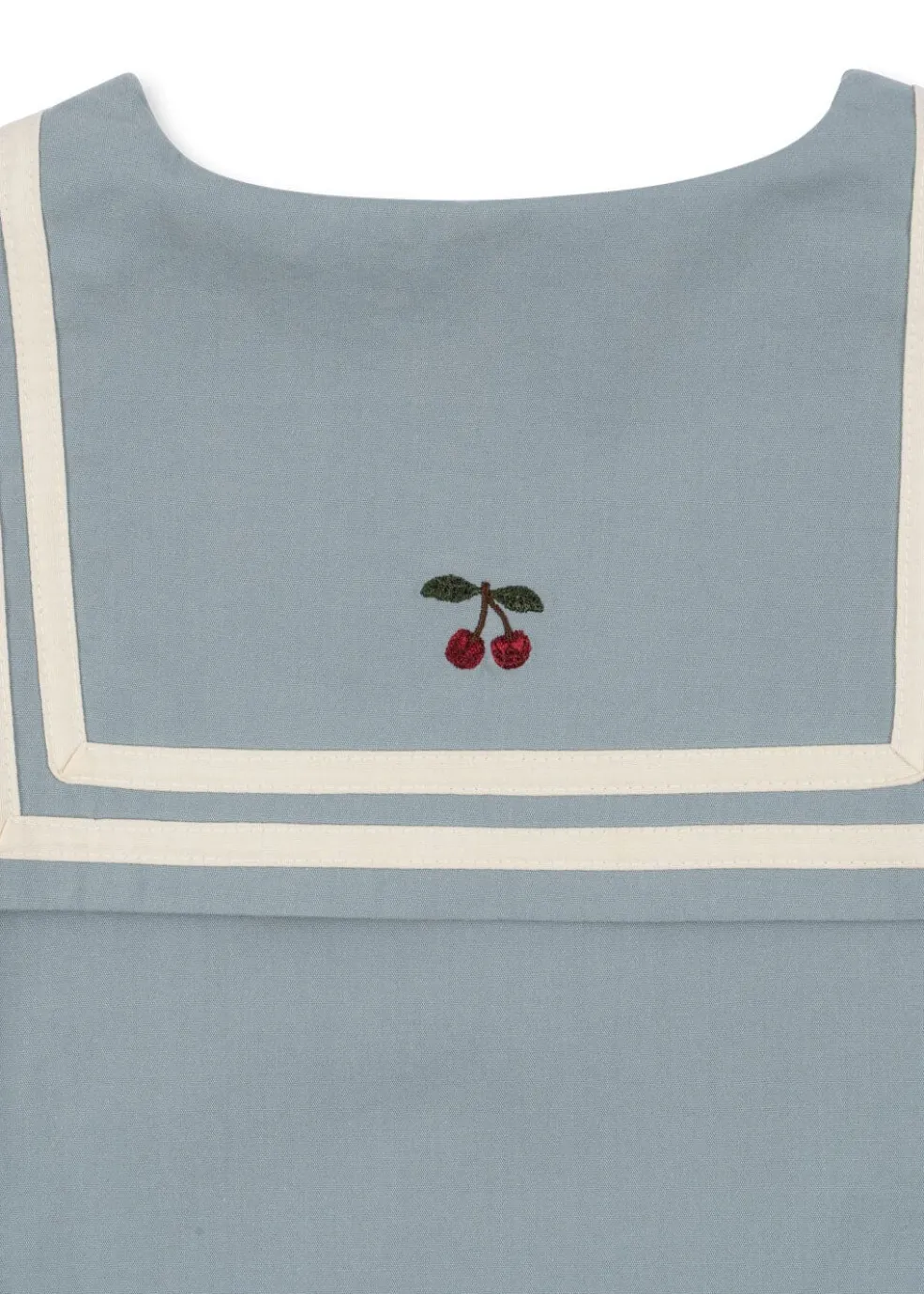 En lyseblå kjole fra Konges Sløjd med sømandskrave og puffede ærmer. De dobbelte striber på kraven og det broderede kirsebærmotiv giver kjolen et maritimt præg.