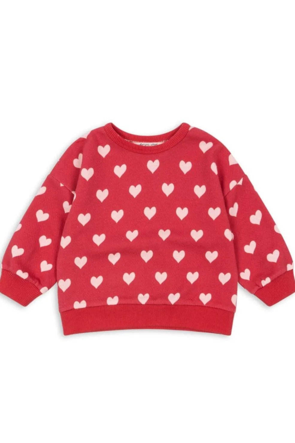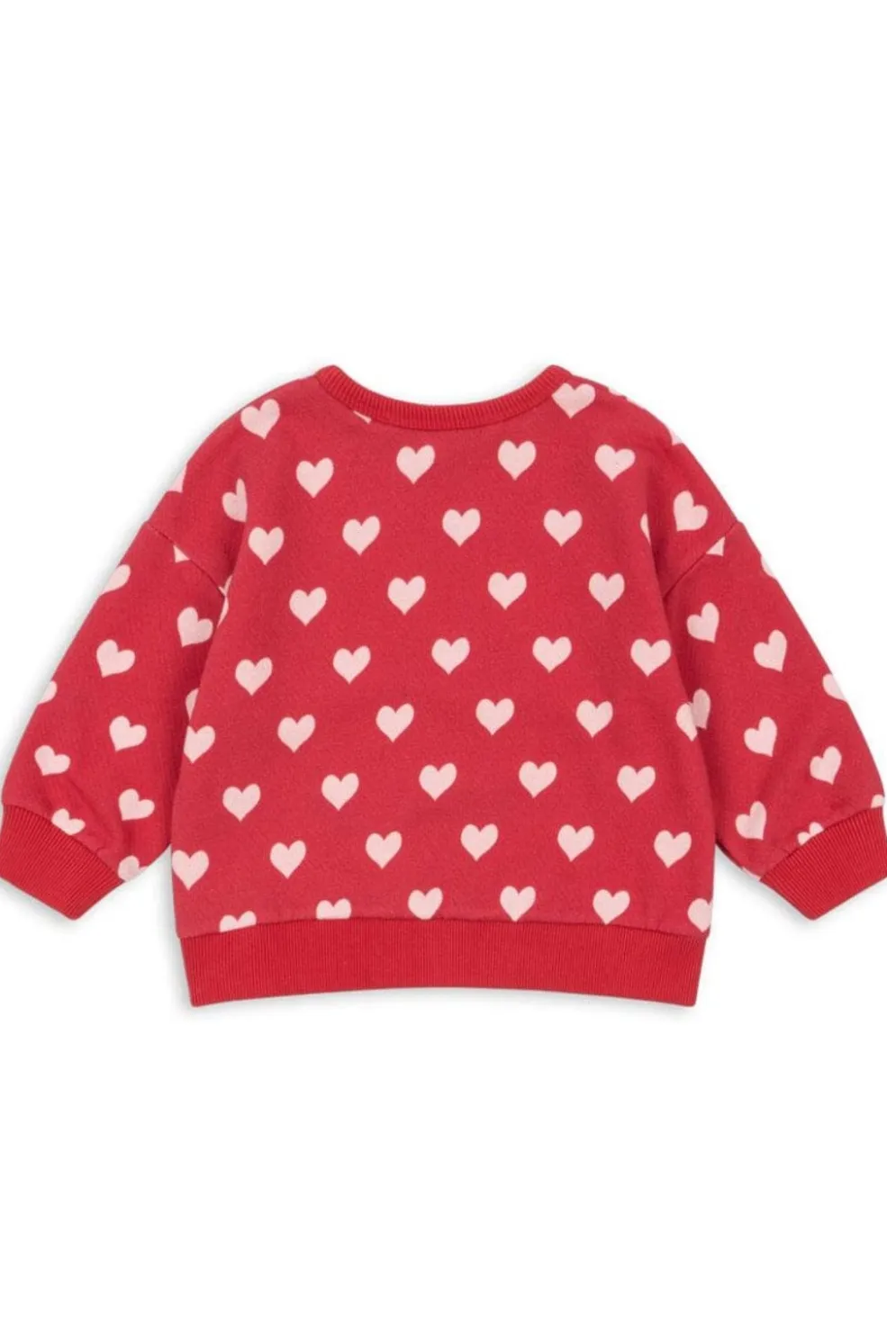 Rød sweatshirt fra Konges Sløjd med hvidt hjertemønster. Trøjen har lange ærmer, rund hals og ribstrikkede kanter ved halsen, ærmerne og nederst.