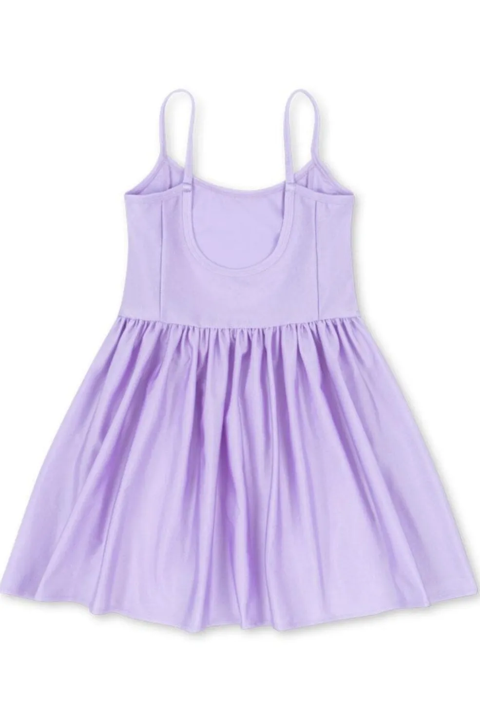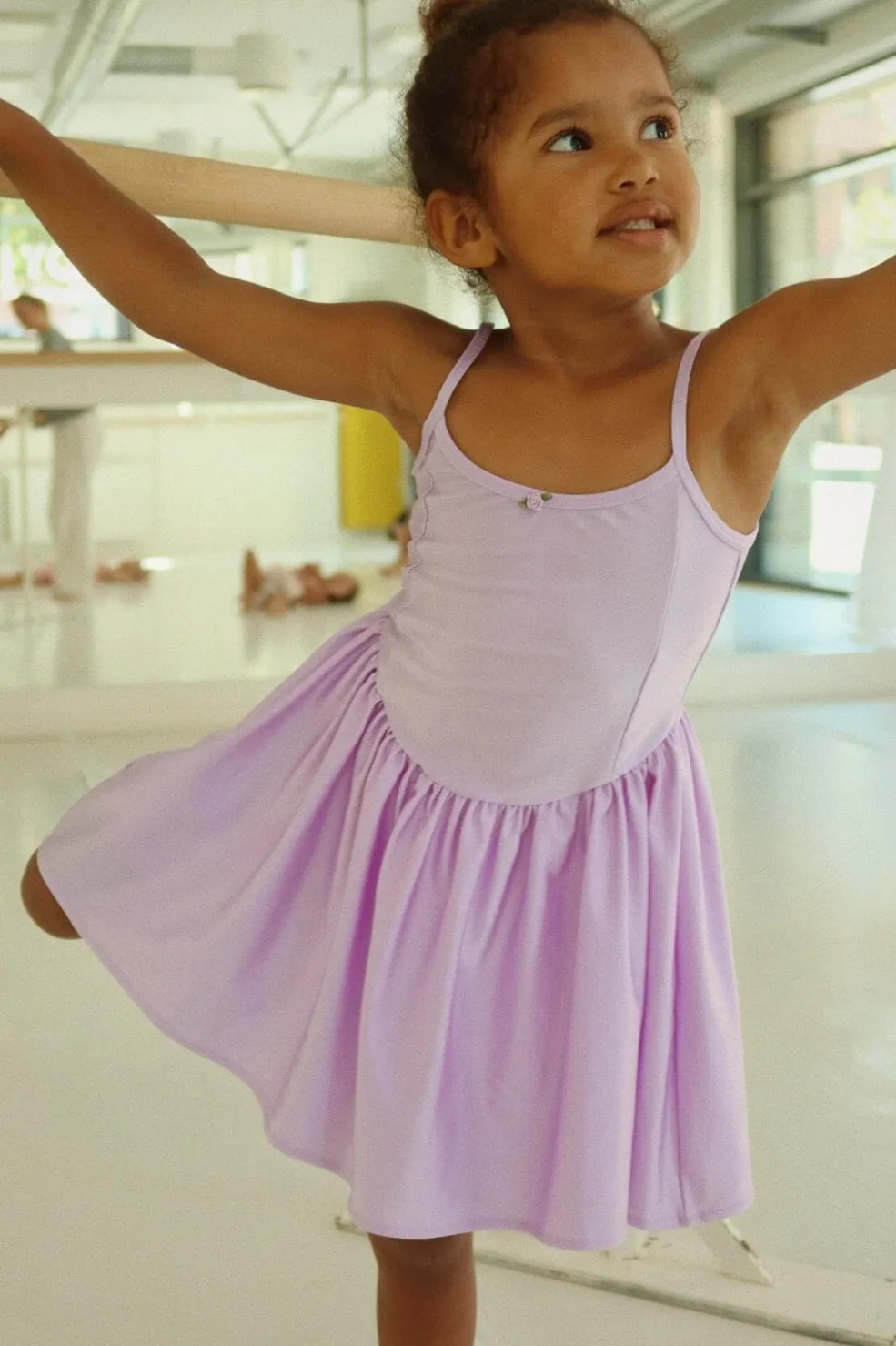 Lavendel lilla kjole fra Konges Sløjd med plisseret skørt og tynde stropper. Den har en rund halsudskæring og en lille rose som pynt på forsiden.