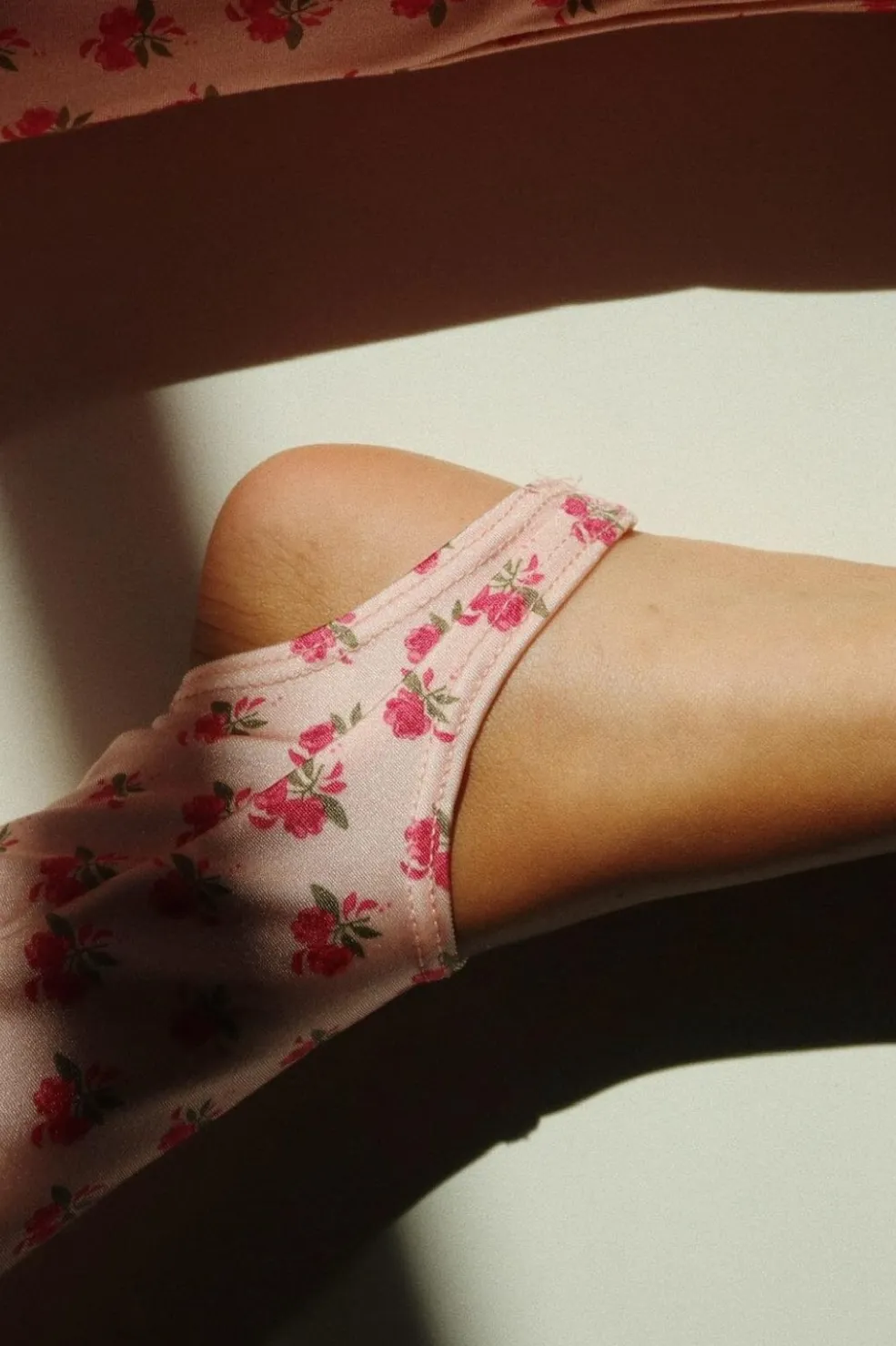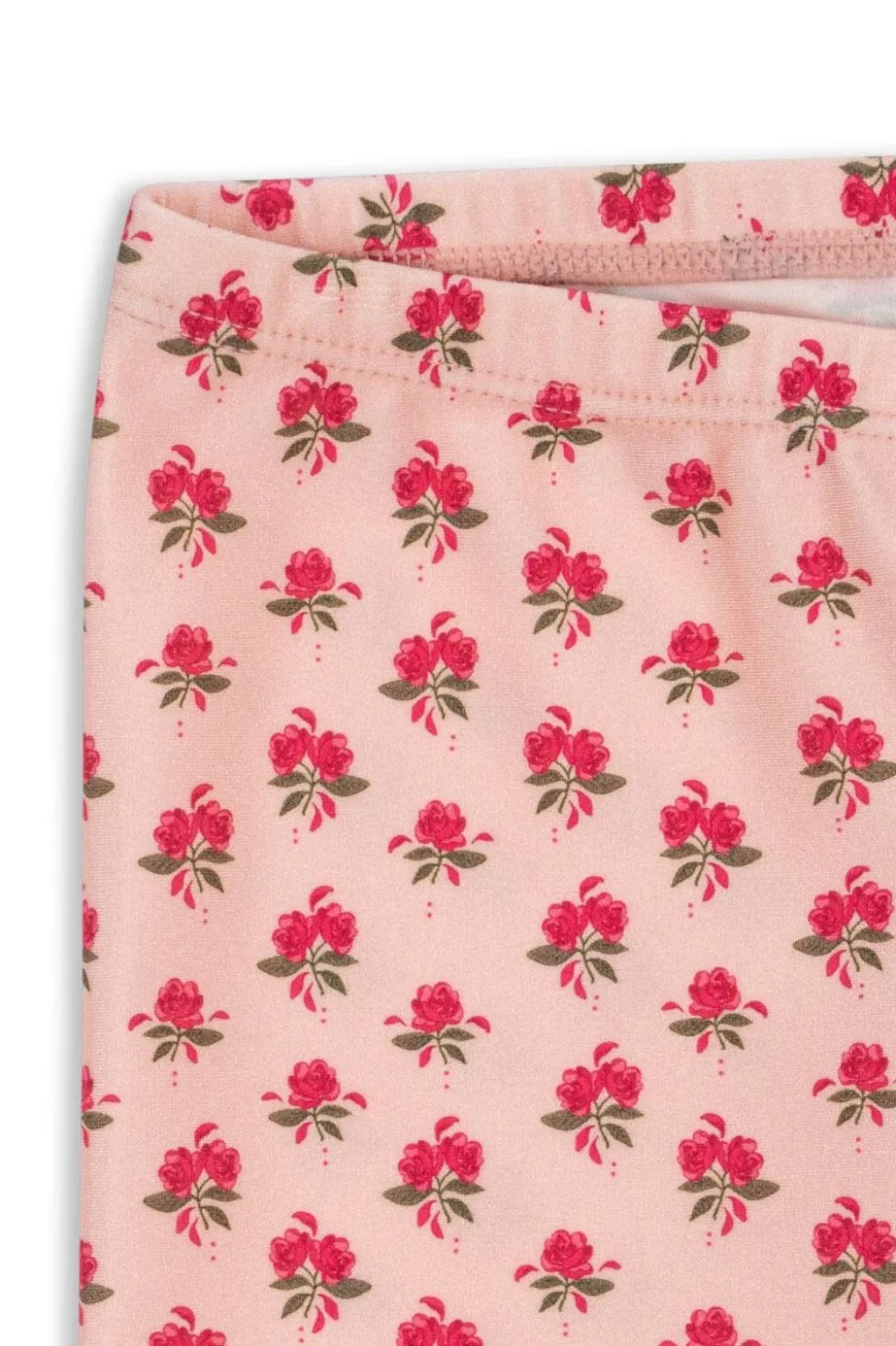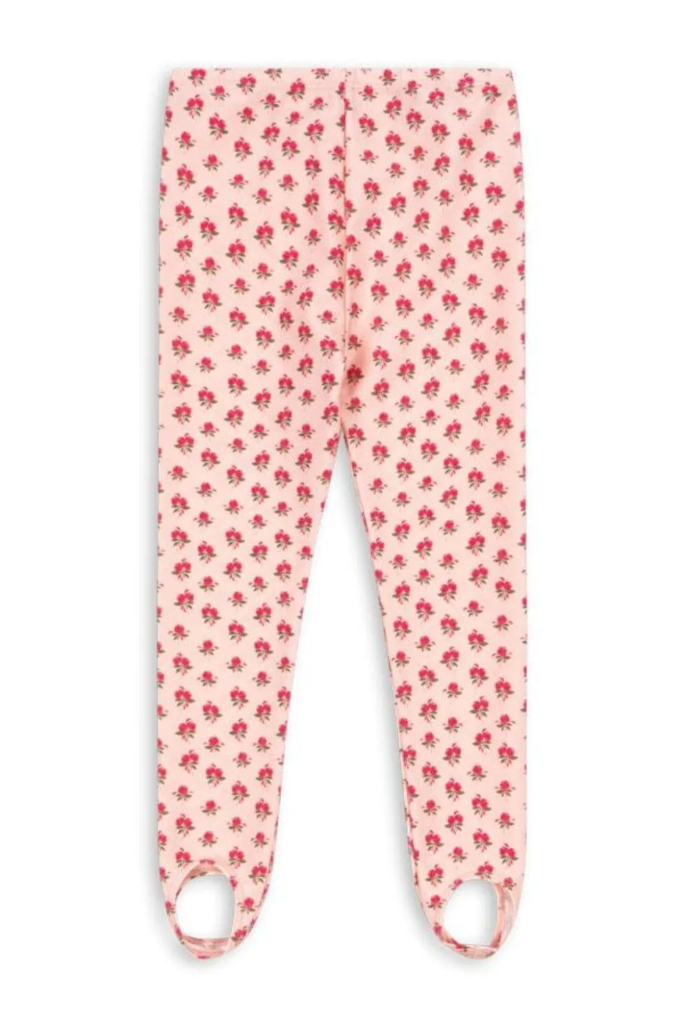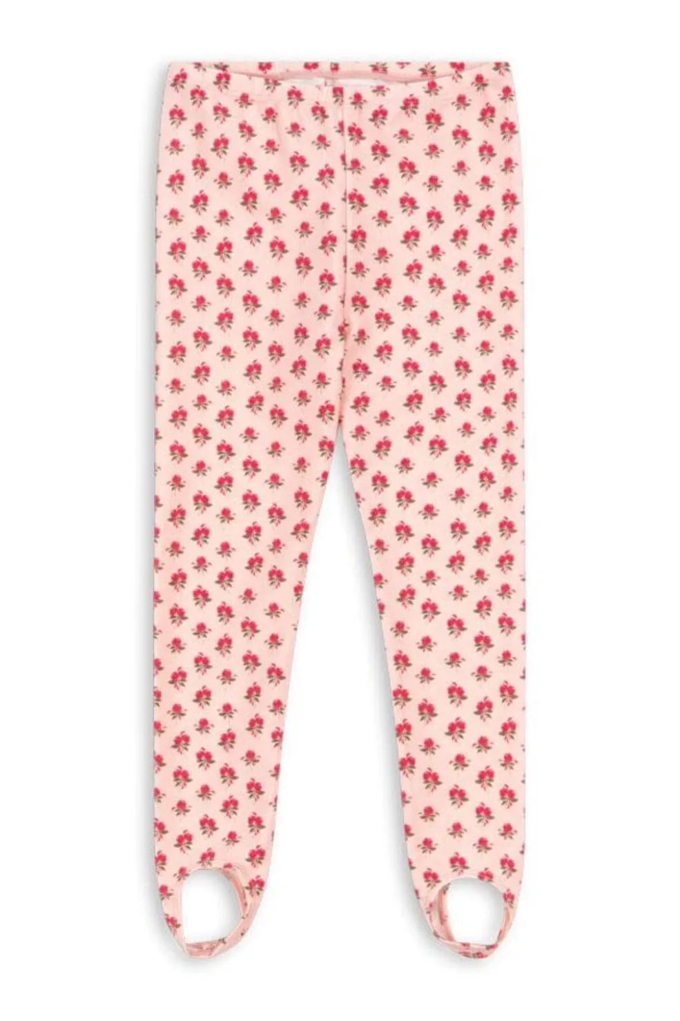 Lange leggings fra Konges Sløjd med små røde roser på lyserød baggrund. De har fodstropper og elastisk talje for god pasform under bevægelse.