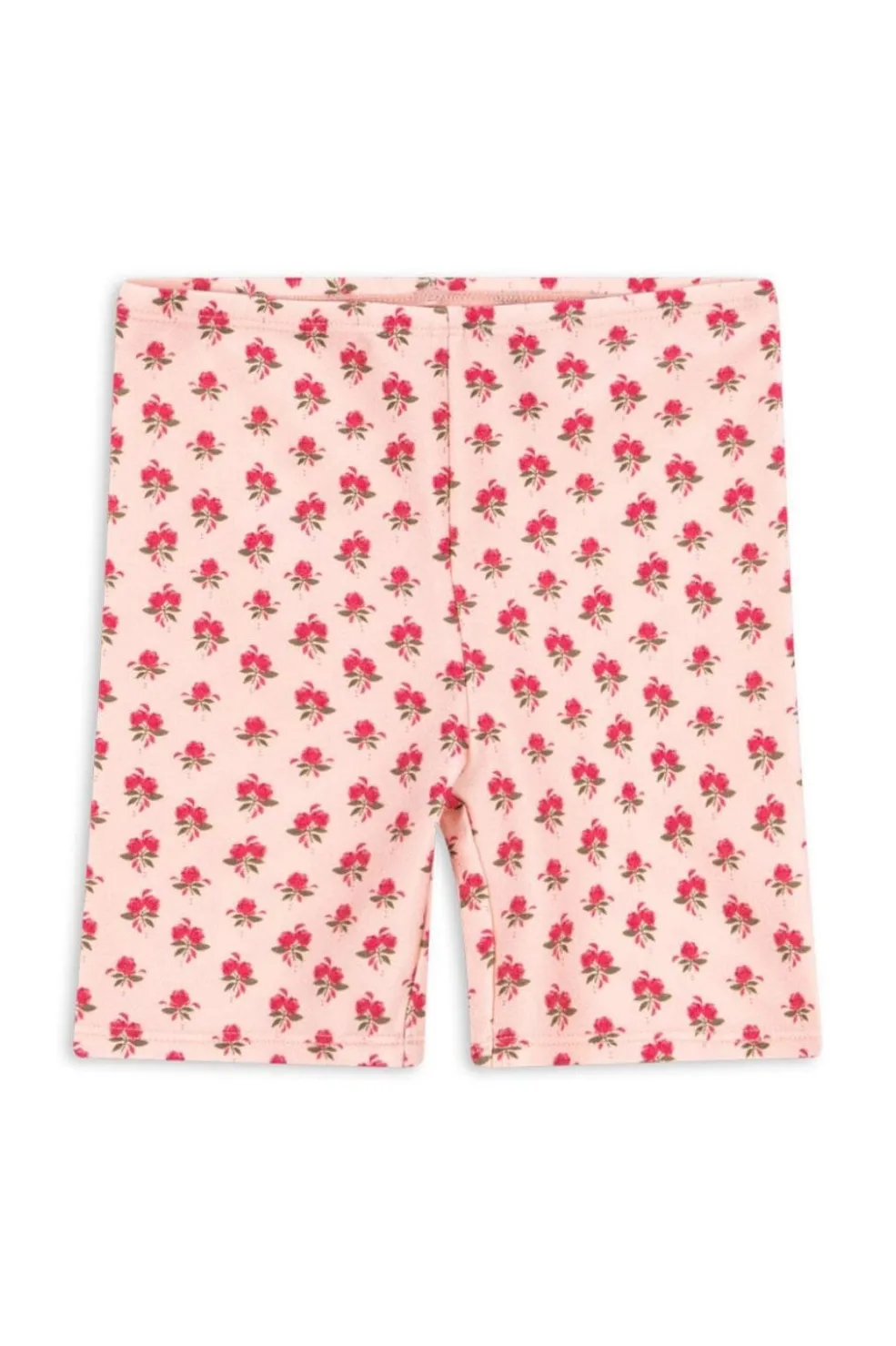 Korte leggings fra Konges Sløjd med lyserødt blomstermønster og flæsedetaljer. Stoffet har en tætsiddende pasform og går til midt på låret.
