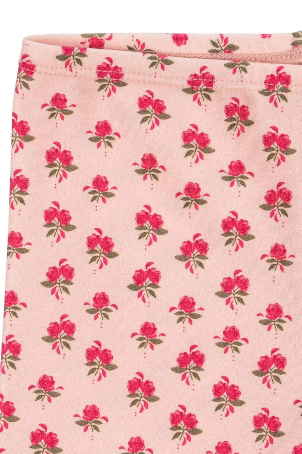 Det lyserøde stof har et fint rosemønster og flæsekanter, der giver leggingsene et sommerligt udtryk.